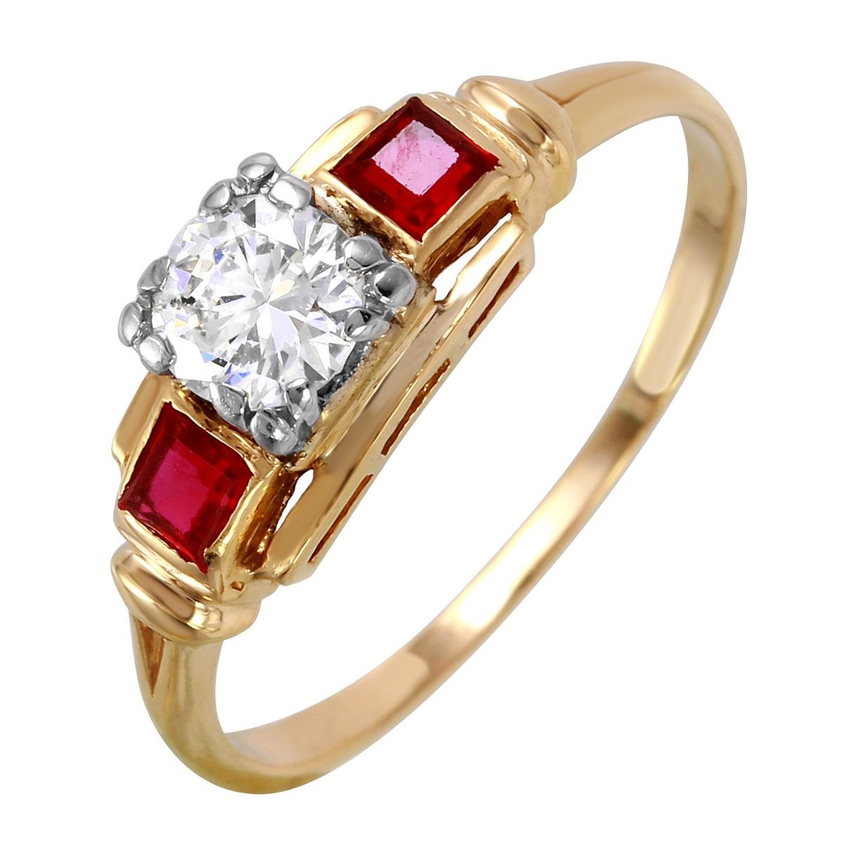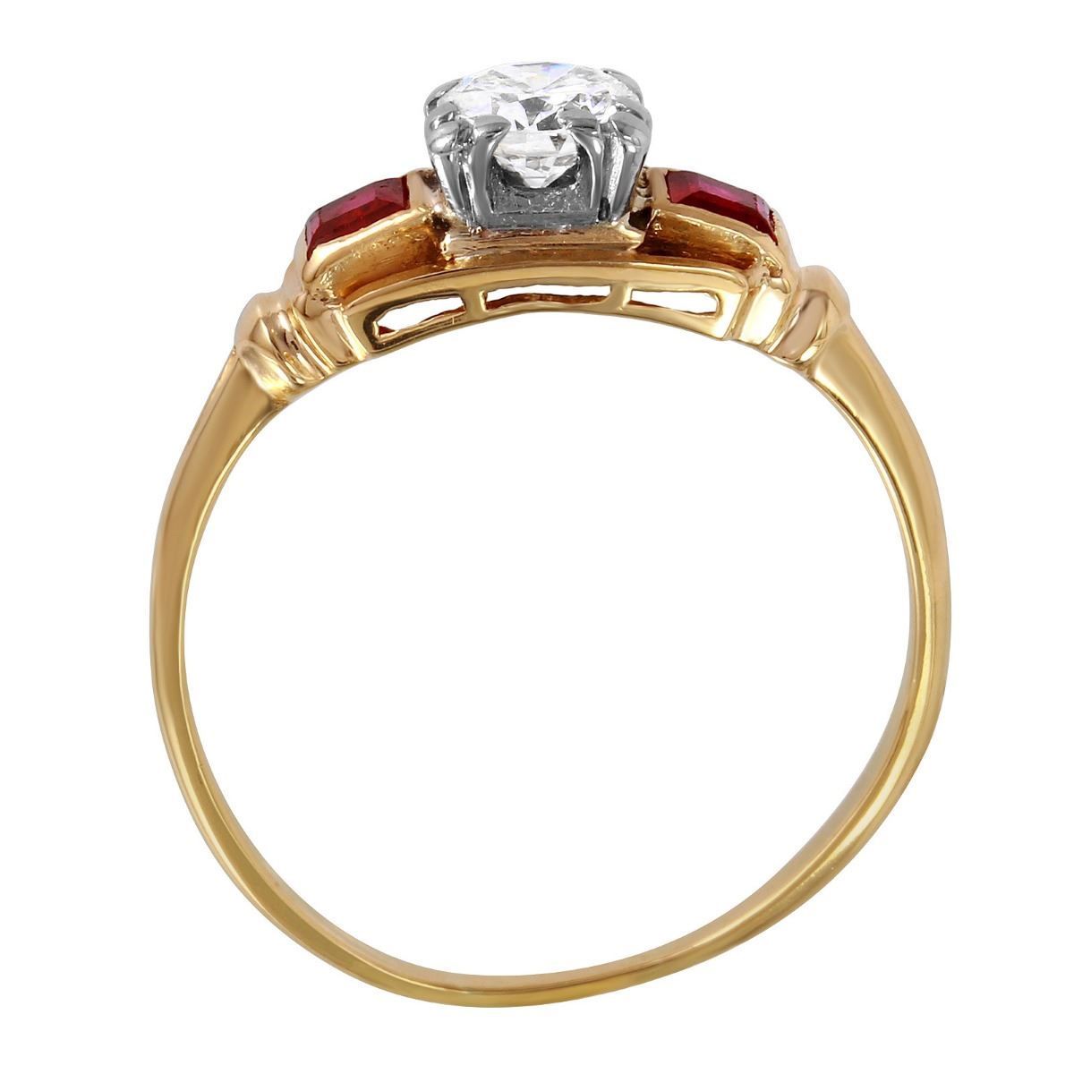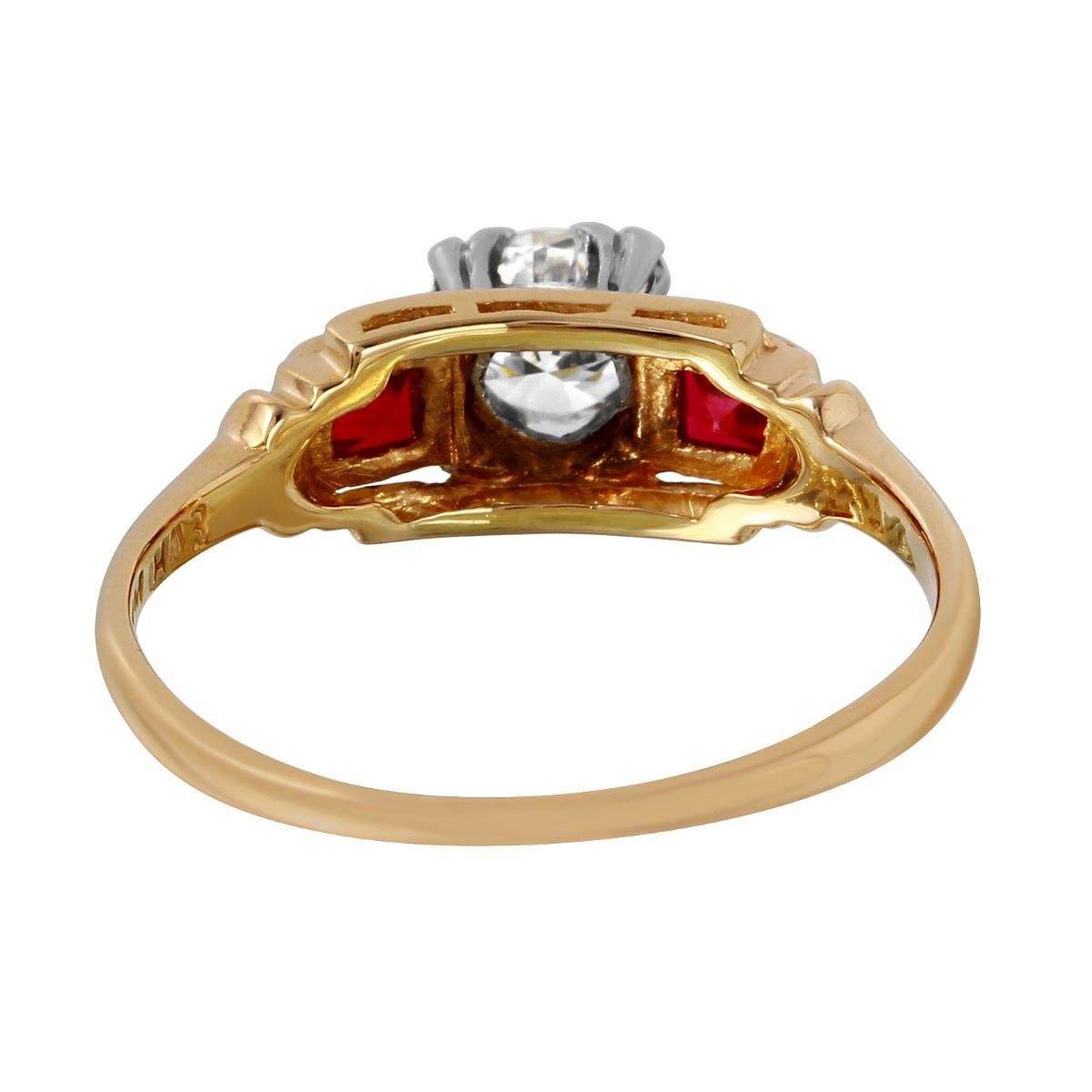 One stamped & tested 14KT yellow gold ladies combination cast & assembled diamond and ruby engagement ring with a bright polish finish. Size 6.25 Identified with markings of "14K". Condition is very good. Containing: One prong set round brilliant cut diamond, measuring 4.80 - 4.80 x 2.88mm (depth est.) approximate weight of 0.41ct. Clarity: SI-1. Color: G, Cut is Very Good. Two bezel set square standard step cut natural rubies, measuring 2.50 x 2.50 x 1.63mm, approximate total weight of 0.20ct., clarity is moderately included, type II, medium dark, moderately strong, red color,cut is good. Approximate Total Weight of Colored Stones 0.20ct. Approximate Total Weight of Diamonds 0.41ct. Total Weight of Engagement Ring 1.75gm. The descriptions listed should not be construed as an appraisal. The detail is provided as a guideline for color, clarity, weights and measurements to the best of our ability. We welcome inspections. WE SHIP WORLDWIDE!