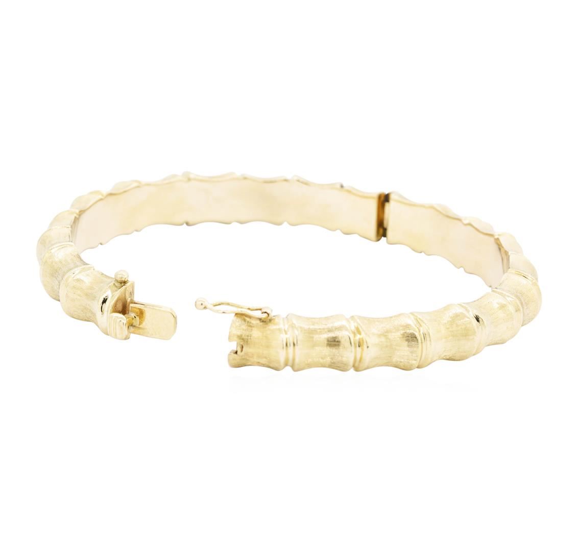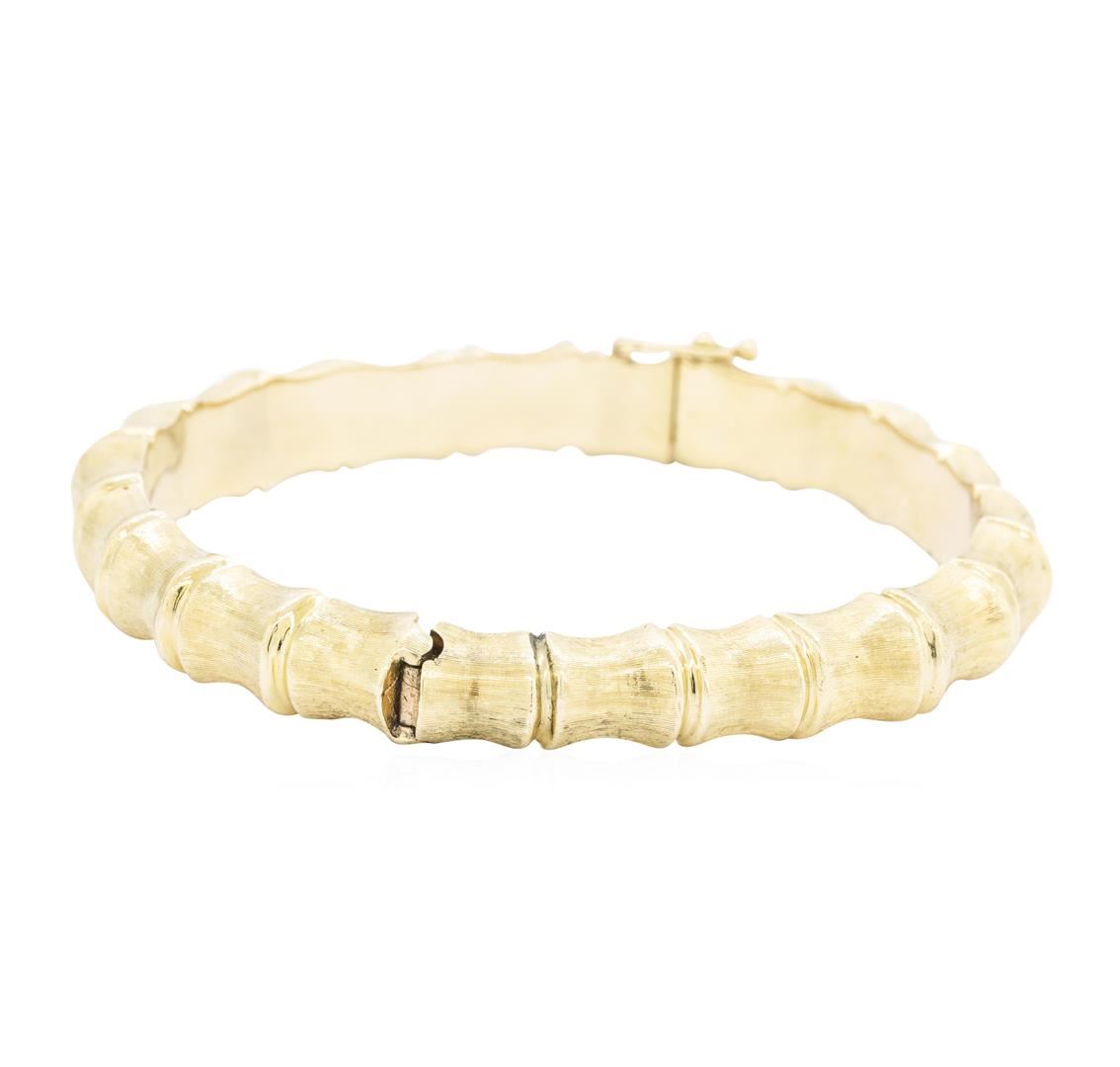 One lady's bamboo motif bangle bracelet featuring: 14KT yellow gold weighing 25.5 grams. The bracelet measures approximately six and a half inches in circumference.