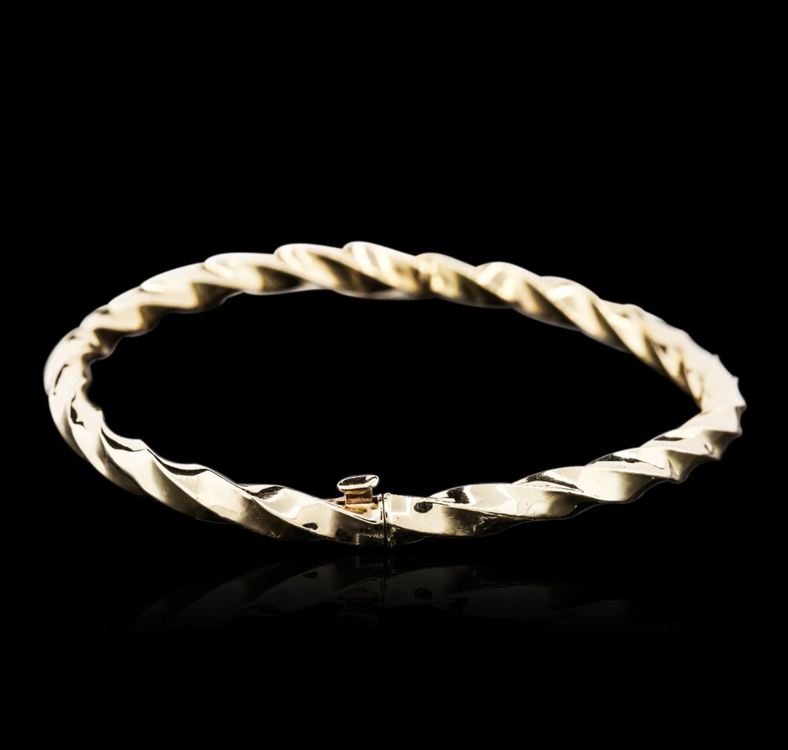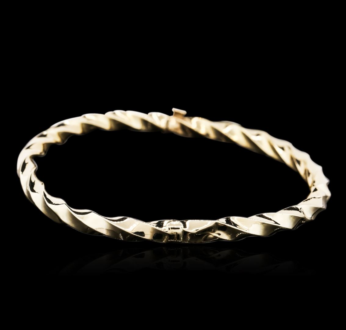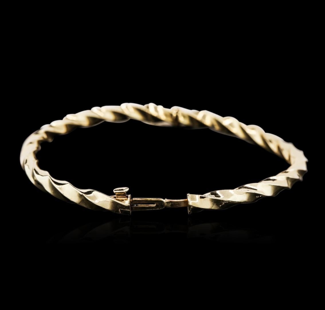 One light weight twist style bangle bracelet featuring: 14KT yellow gold weighing 4.80 grams.