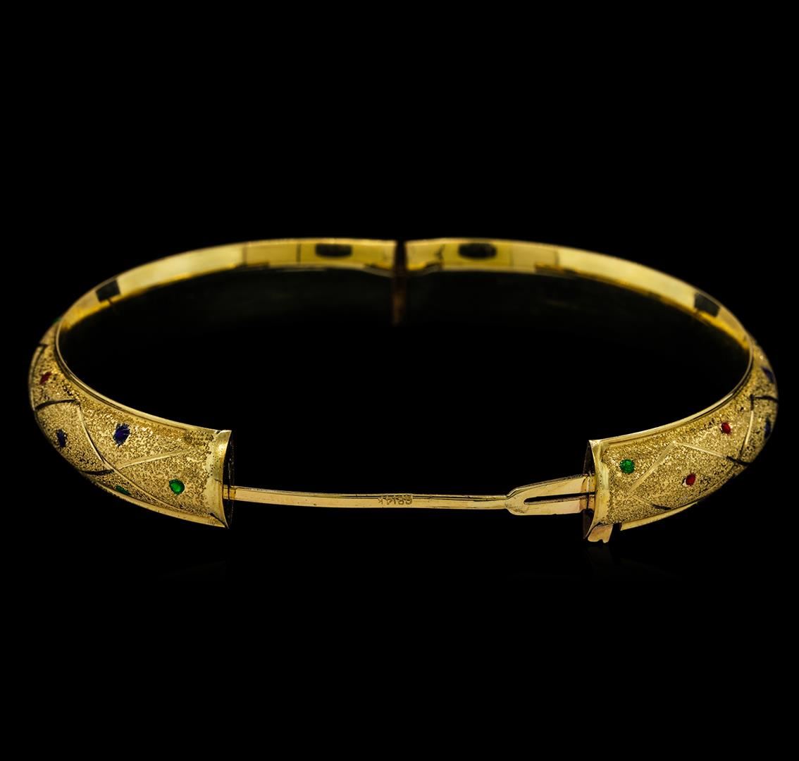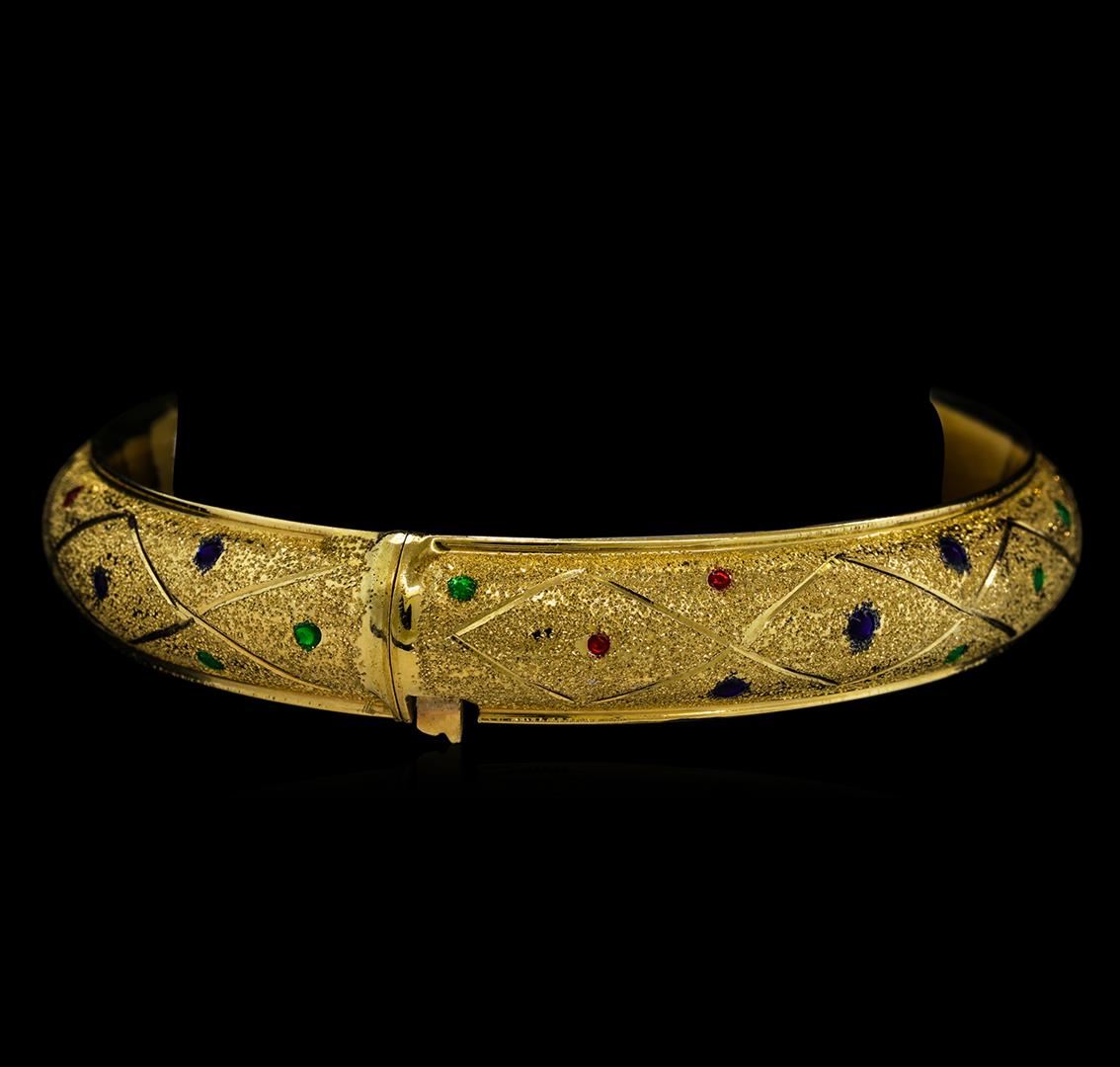 One electronically tested 14KT yellow gold ladies cast & assembled gold bangle bracelet. The seven inch wearable length bangle features a ten millimeter wide convex band with red, green and blue dispersed enamel accents, completed by a hinged opening with a safety mechanism. Bright polish and brushed satin finish. Identified with markings of "14K". Condition is good. Total Weight of Bangle Bracelet 15.74 gm. AIG Appraised at $2,820.00.