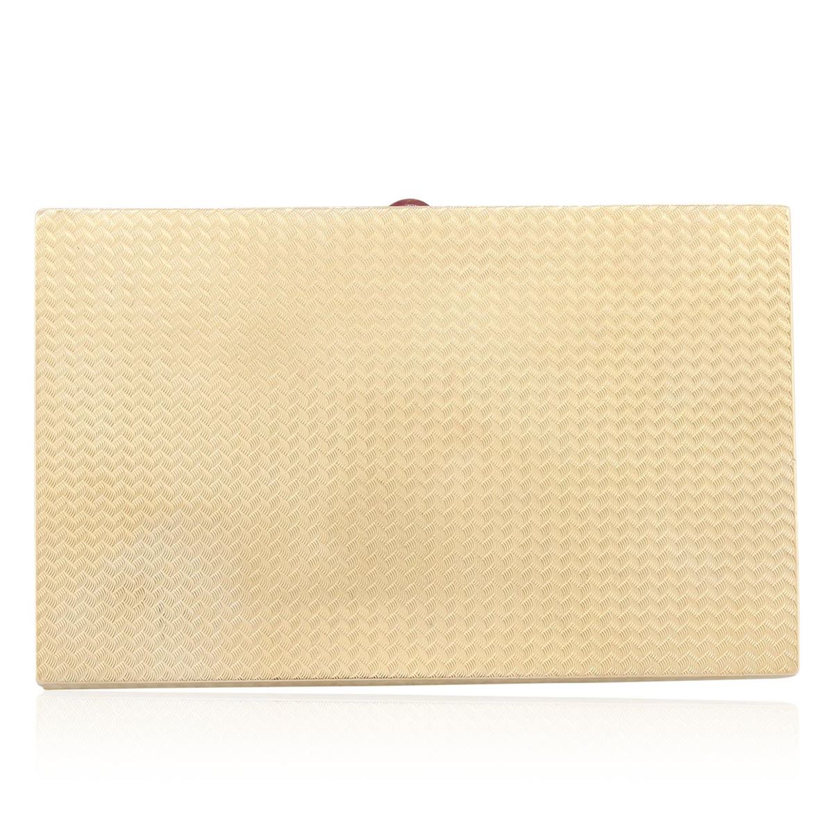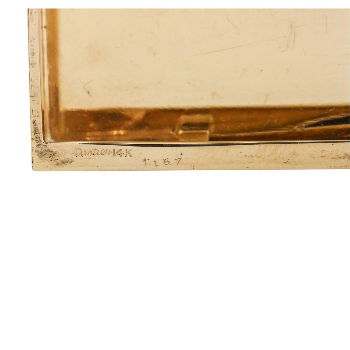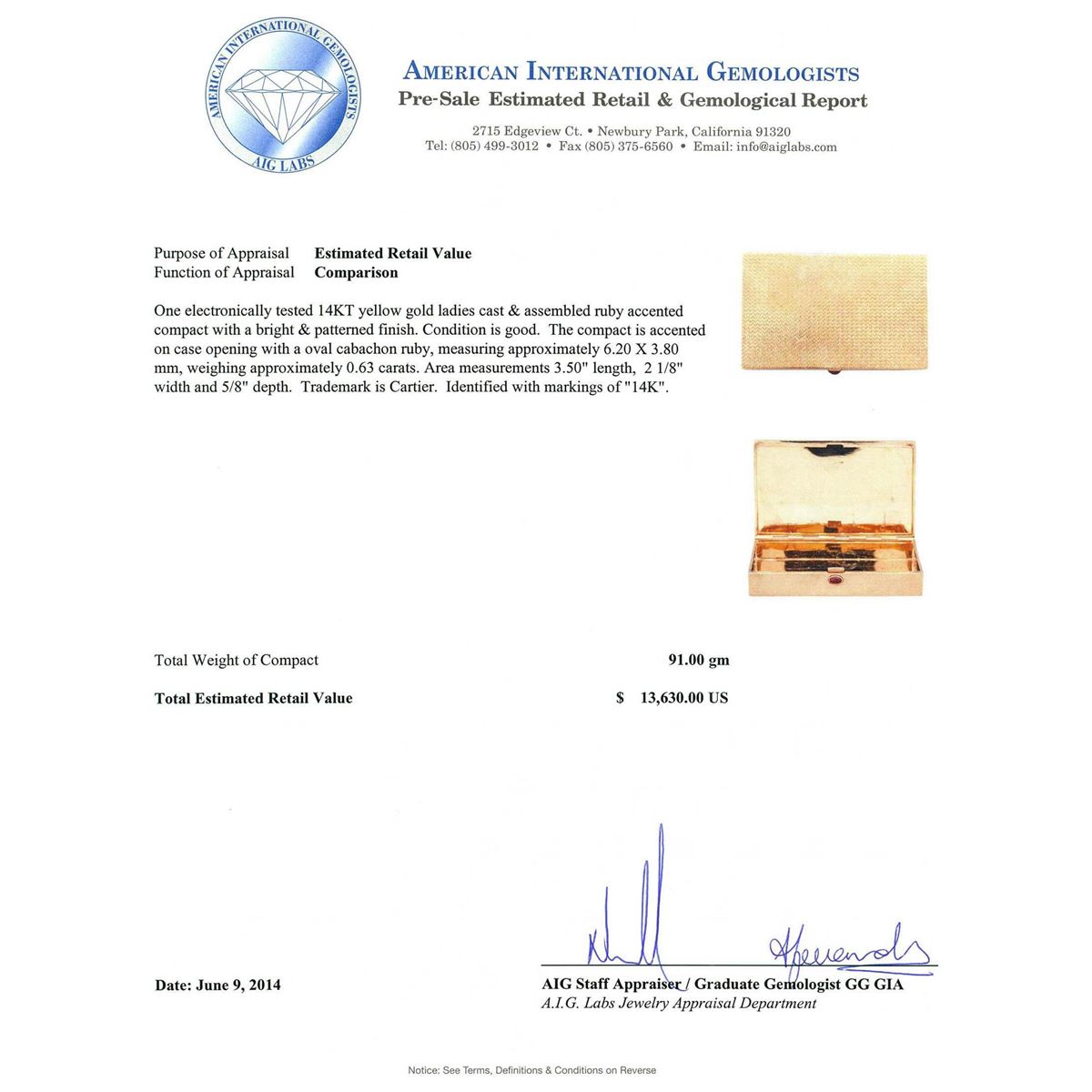 One electronically tested 14KT yellow gold ladies cast & assembled ruby accented compact with a bright & patterned finish. Condition is good. The compact is accented on case opening with a oval cabachon ruby, measuring approximately 6.20 X 3.80 mm, weighing approximately 0.63 carats. Area measurements 3.50" length, 2 1/8" width and 5/8" depth. Trademark is Cartier. Identified with markings of "14K". Total Weight of Compact 91.00 grams. AIG Appraised at $13,630.00.