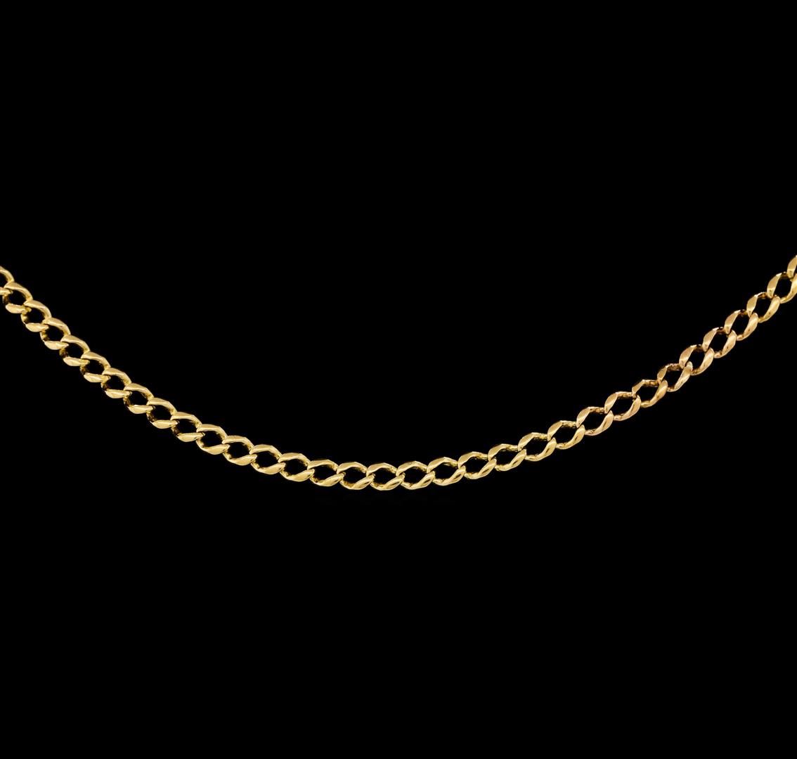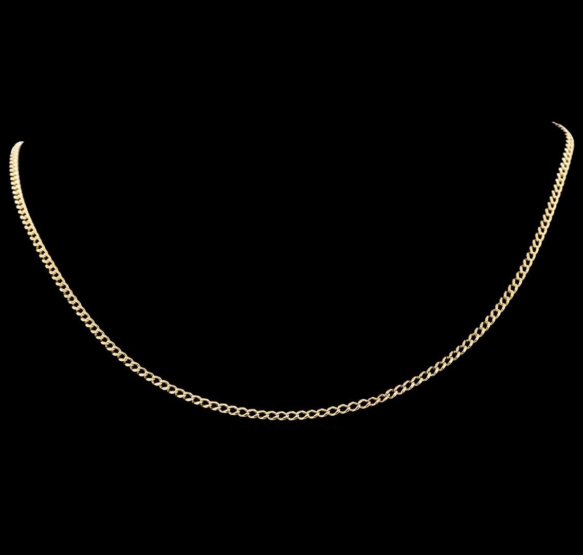 One rounded curb link chain measuring twenty-three inches in length featuring: 14KT yellow gold weighing 12.2 grams.