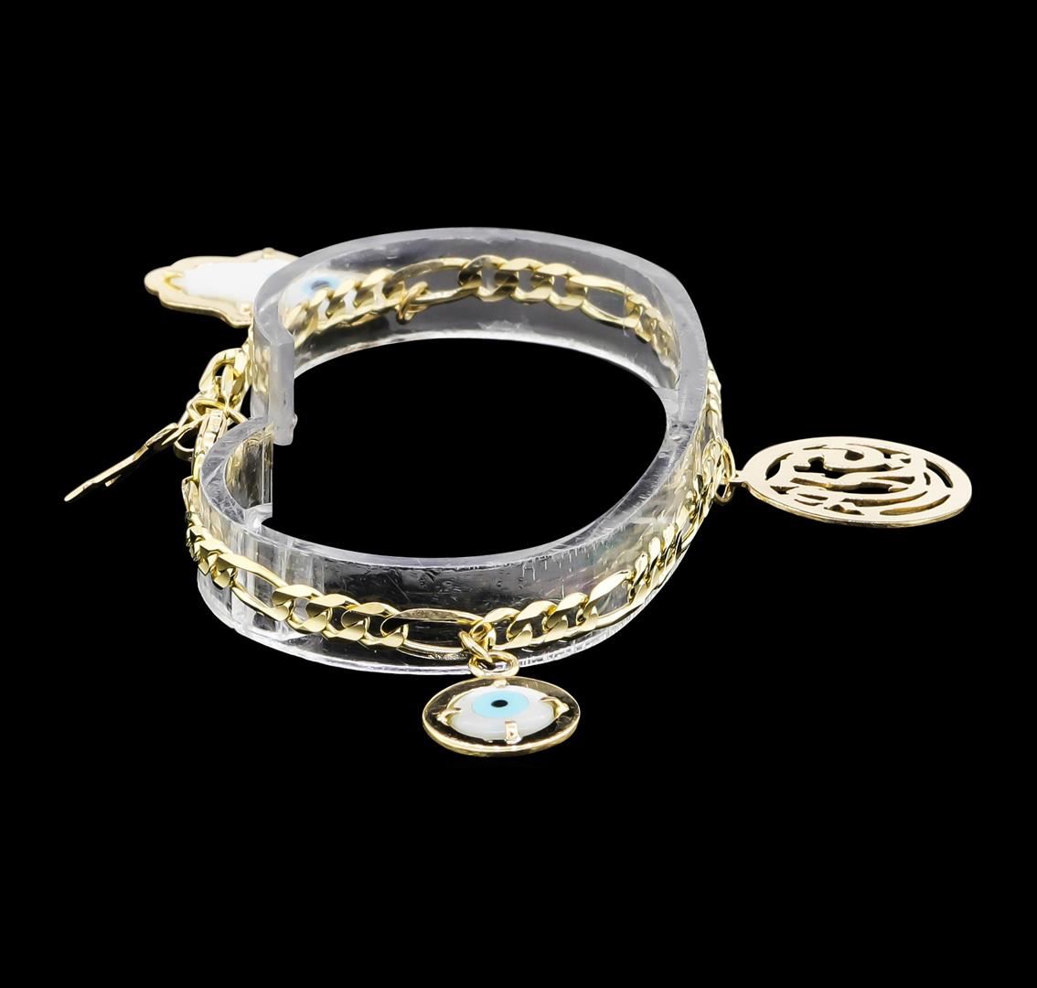 One Ladies charm bracelet measuring 7.5 inches long featuring: 14KT yellow gold weighing 9.5 grams containing two evil eye charms, a cross charm and a round charm.