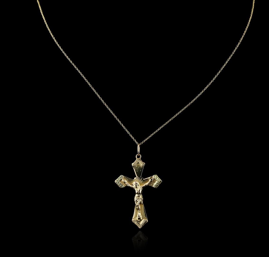 One cross pendant with chain featuring: 14KT yellow gold weighing 5.00 grams.