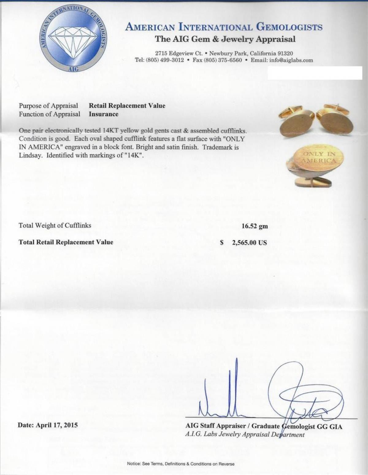One pair electronically tested 14KT yellow gold gents cast & assembled cufflinks. Condition is good. Each oval shaped cufflink features a flat surface with "ONLY IN AMERICA" engraved in a block font. Bright and satin finish. Trademark is Lindsay. Identified with markings of "14K". Total Weight of Cufflinks: 16.52 gm. AIG Appraised.