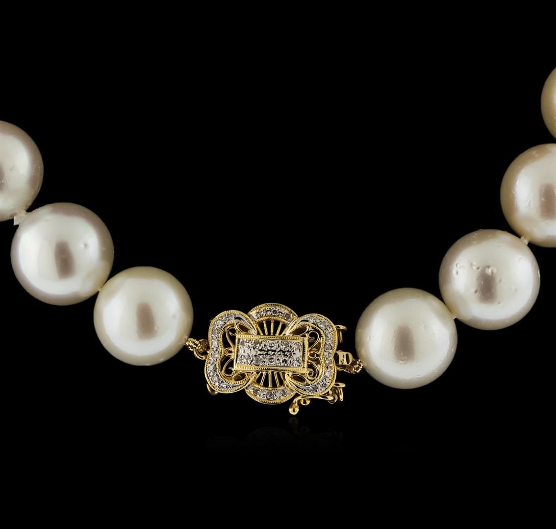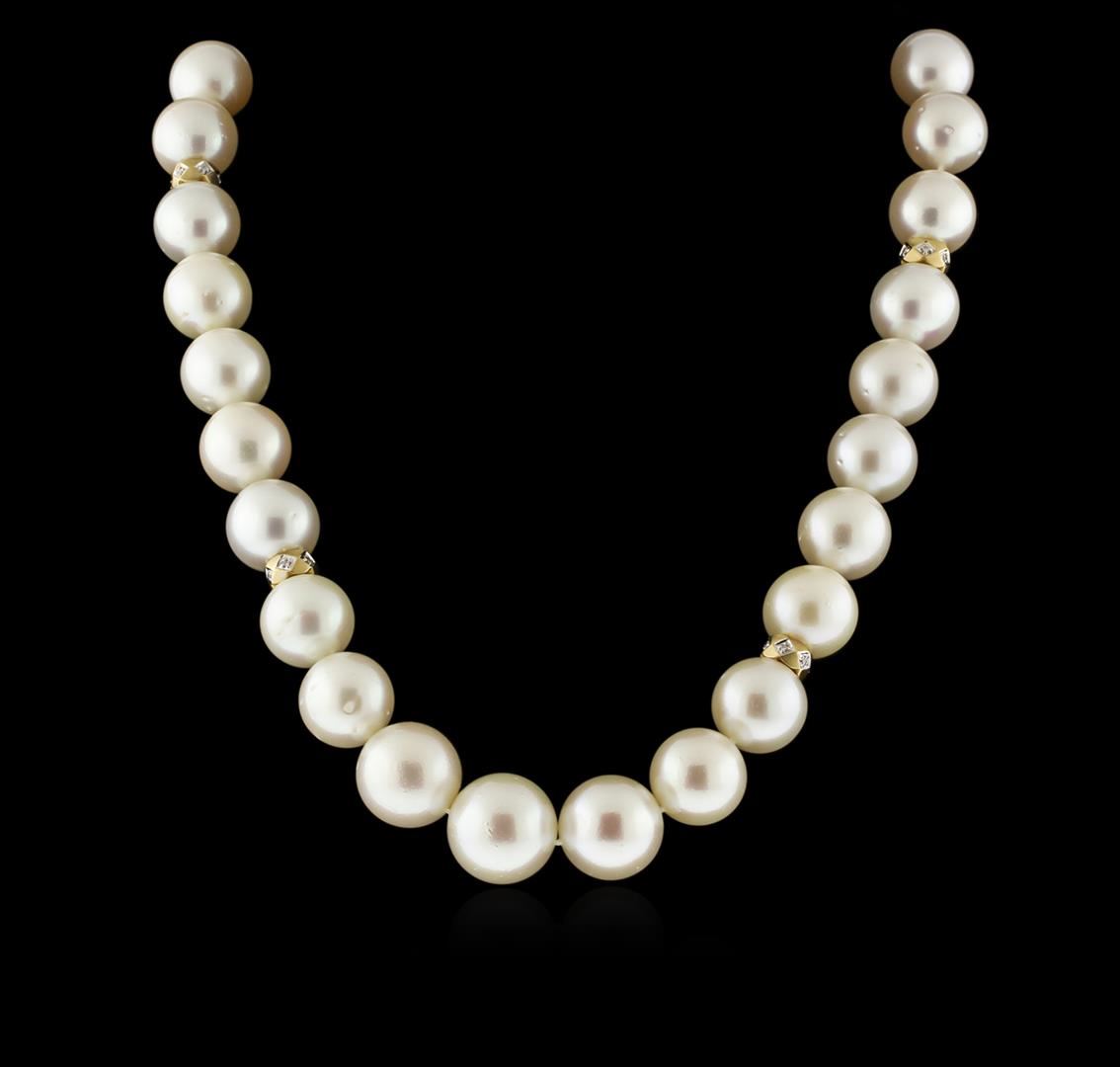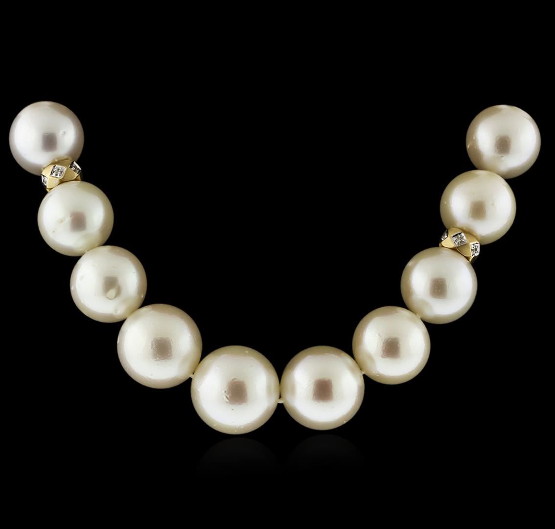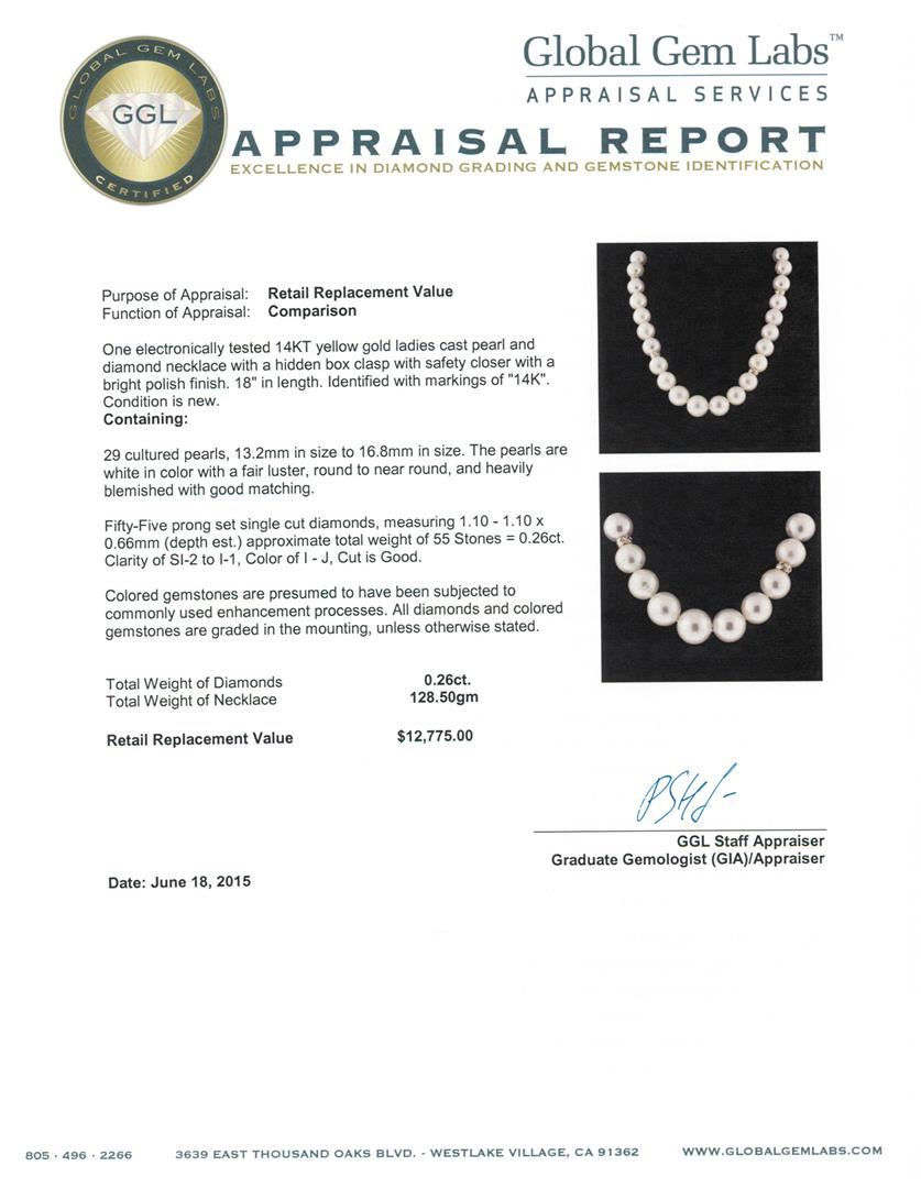 One electronically tested 14KT yellow gold ladies cast pearl and diamond necklace with a hidden box clasp with safety closer with a bright polish finish. 18" in length. Identified with markings of "14K". Condition is new. Containing: 29 south sea cultured pearls, 13.2mm in size to 16.8mm in size. The pearls are white in color with a fair luster, round to near round, and heavily blemished with good matching. Fifty-Five prong set single cut diamonds, measuring 1.10 - 1.10 x 0.66mm (depth est.) approximate total weight of 55 Stones = 0.26ct. Clarity: SI-2 to I-1. Color: I - J, Cut is Good. Colored gemstones are presumed to have been subjected to commonly used enhancement processes. All diamonds and colored gemstones are graded in the mounting, unless otherwise stated. Total Weight of Diamonds 0.26ct. Total Weight of Necklace128.50 grams. GGL Appraised at $12,775.00.