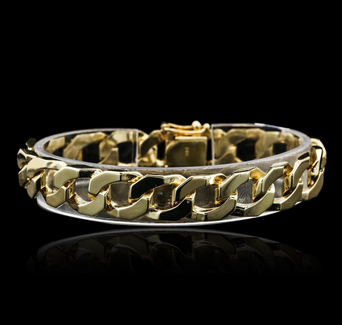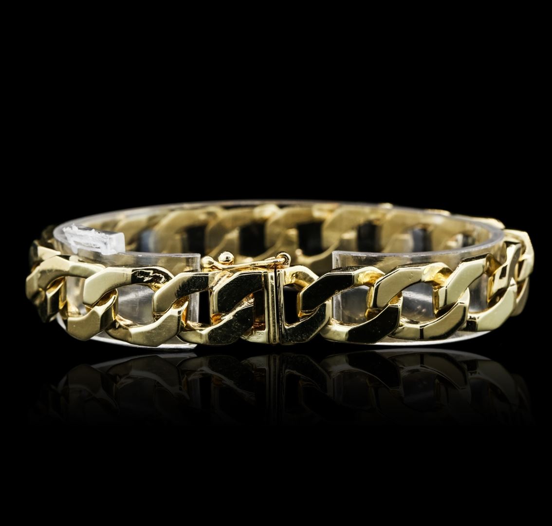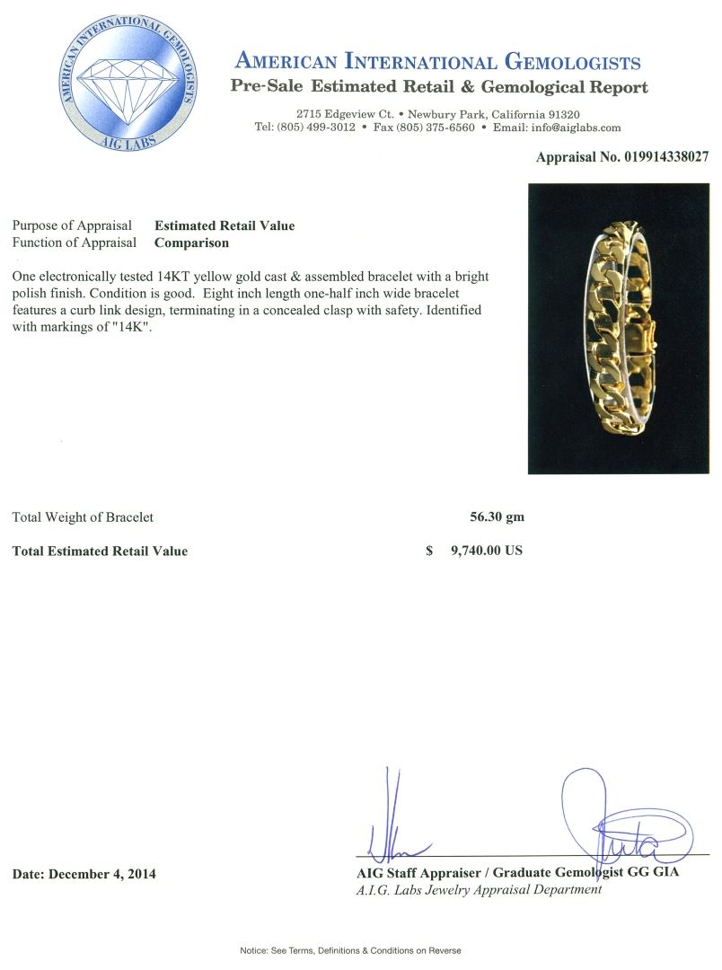 One electronically tested 14KT yellow gold cast & assembled bracelet with a bright polish finish. Eight inch length one-half inch wide bracelet features a curb link design, terminating in a concealed clasp with safety. Identified with markings of "14K". Condition is good. Total Weight of Bracelet 56.30 grams. AIG Appraised at $9,740.00.