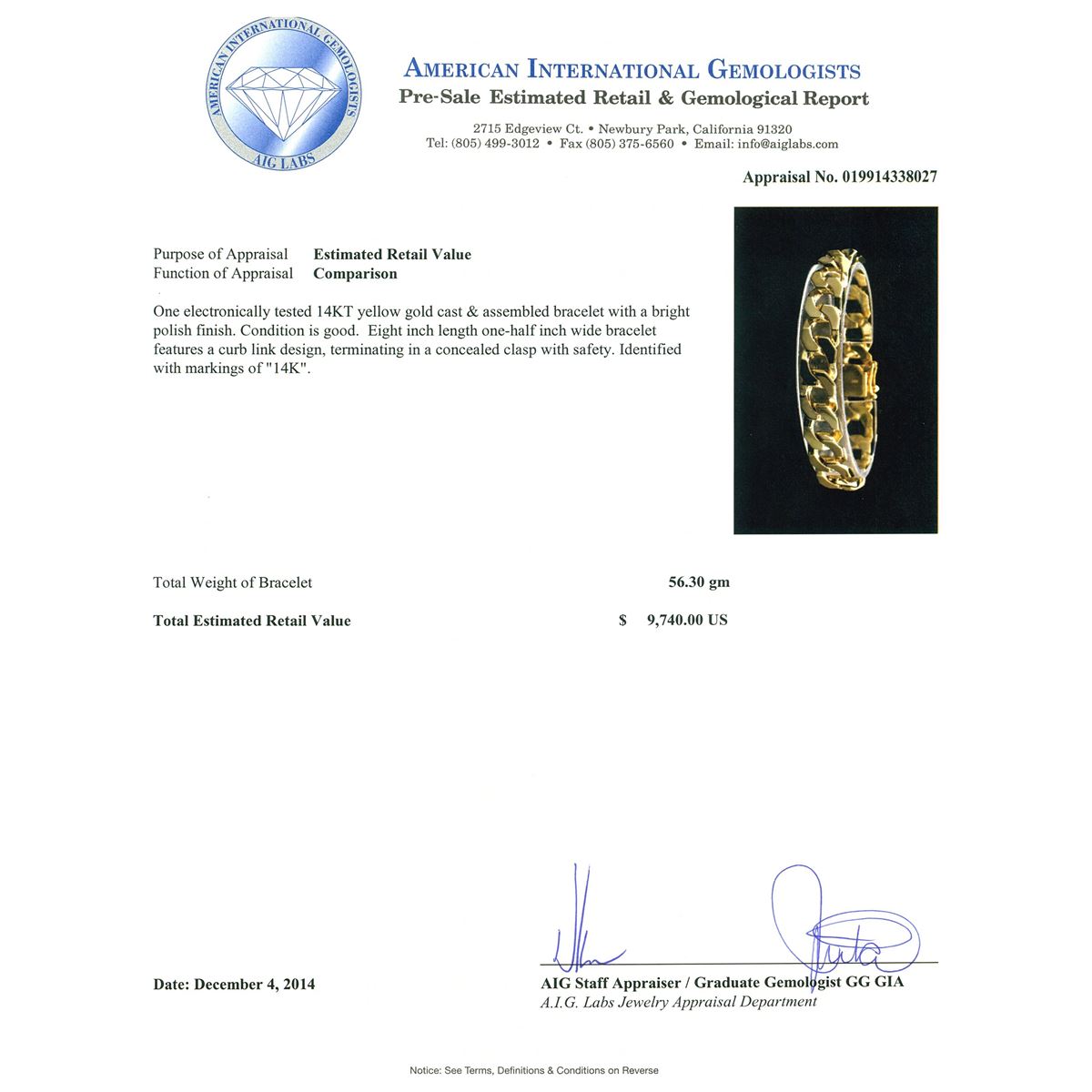 One electronically tested 14KT yellow gold cast & assembled bracelet with a bright polish finish. Eight inch length one-half inch wide bracelet features a curb link design, terminating in a concealed clasp with safety. Identified with markings of "14K". Condition is good. Total Weight of Bracelet 56.30 grams. AIG Appraised at $9,740.00.
