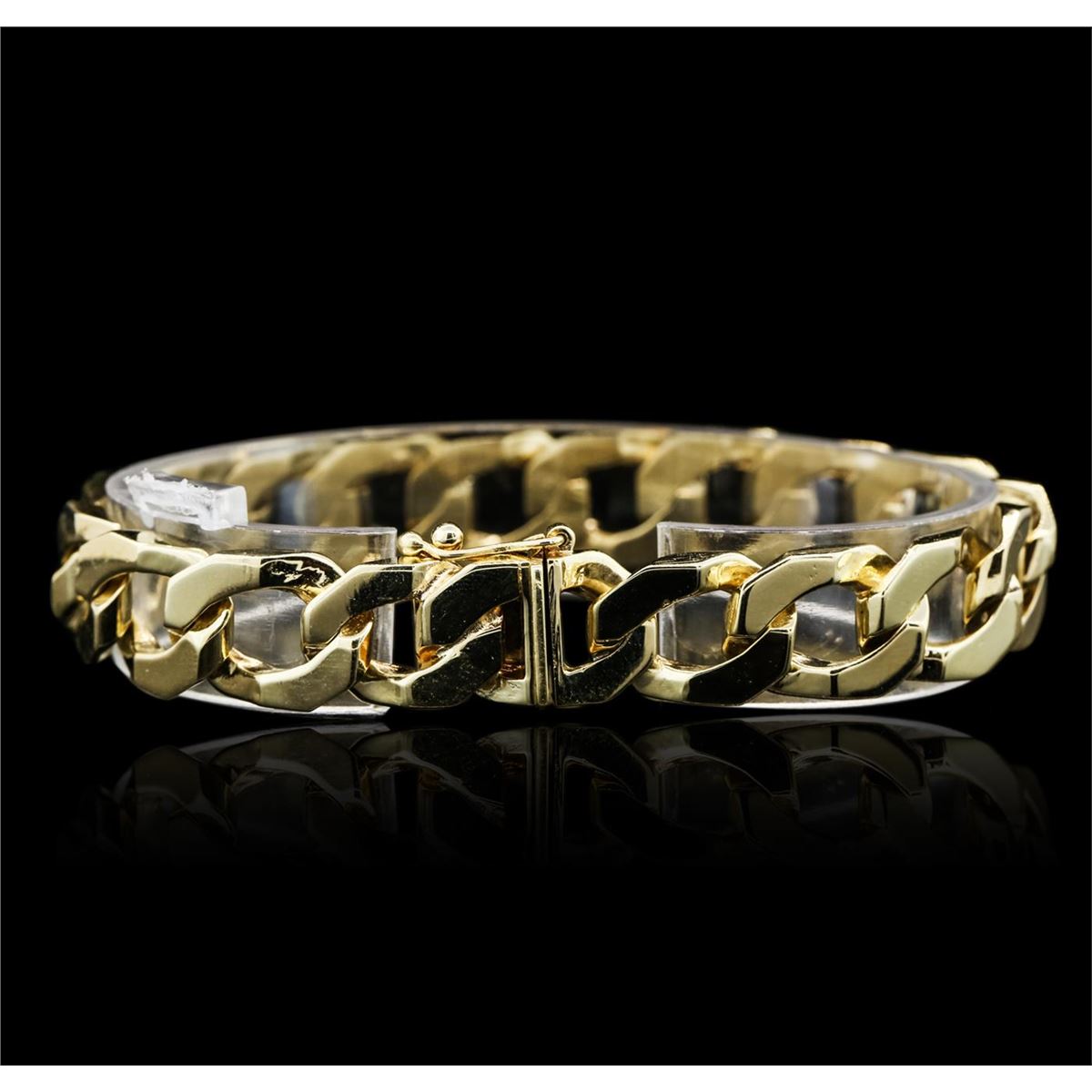One electronically tested 14KT yellow gold cast & assembled bracelet with a bright polish finish. Eight inch length one-half inch wide bracelet features a curb link design, terminating in a concealed clasp with safety. Identified with markings of "14K". Condition is good. Total Weight of Bracelet 56.30 grams. AIG Appraised at $9,740.00.