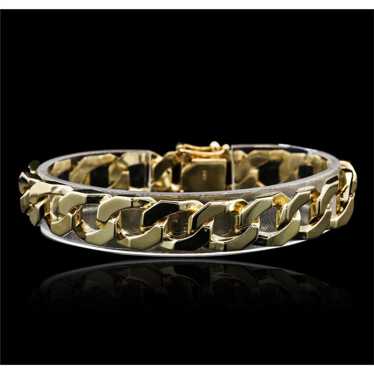 One electronically tested 14KT yellow gold cast & assembled bracelet with a bright polish finish. Eight inch length one-half inch wide bracelet features a curb link design, terminating in a concealed clasp with safety. Identified with markings of "14K". Condition is good. Total Weight of Bracelet 56.30 grams. AIG Appraised at $9,740.00.