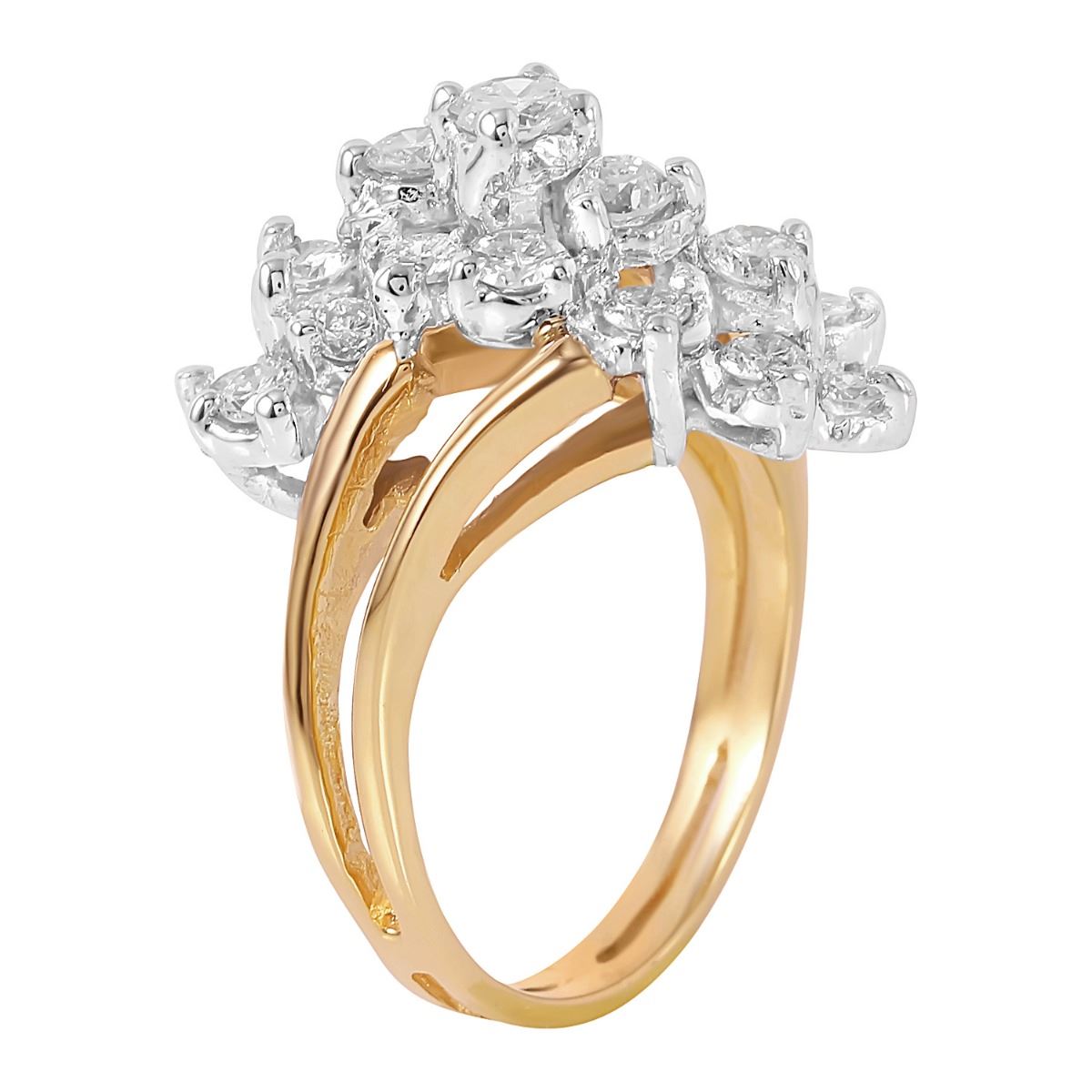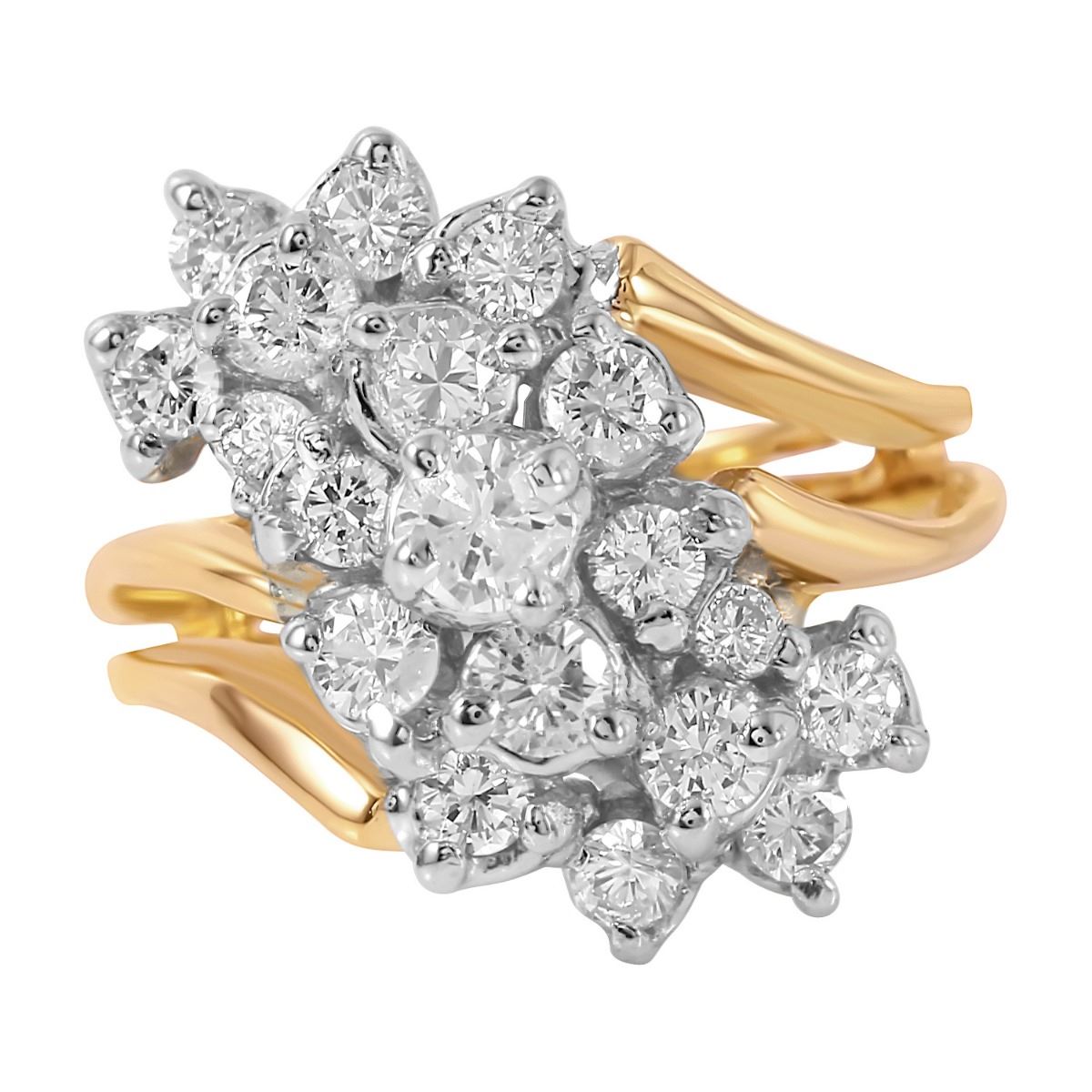One electronically tested 14KT yellow gold ladies combination cast & assembled cluster diamond ring with a bright polish finish. Condition is very good. Containing: Nineteen prong set round brilliant cut diamonds, measuring 3.60 - 2.00 x 1.68mm (depth est.) approximate total weight of 19 Stones = 1.75ct. Clarity: SI-1 to I-1. Color: I - J, Cut is Very Good. Approximate Total Weight of Diamonds 1.75ct. Total Weight of Diamond Ring 6.30gm. Ring Size 5.5. The descriptions listed should not be construed as an appraisal. The detail is provided as a guideline for color, clarity, weights and measurements to the best of our ability. We welcome inspections. WE SHIP WORLDWIDE!