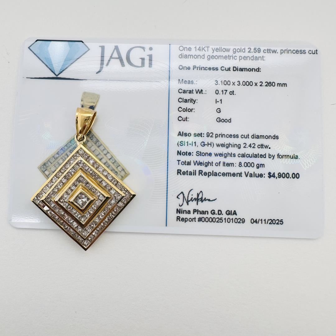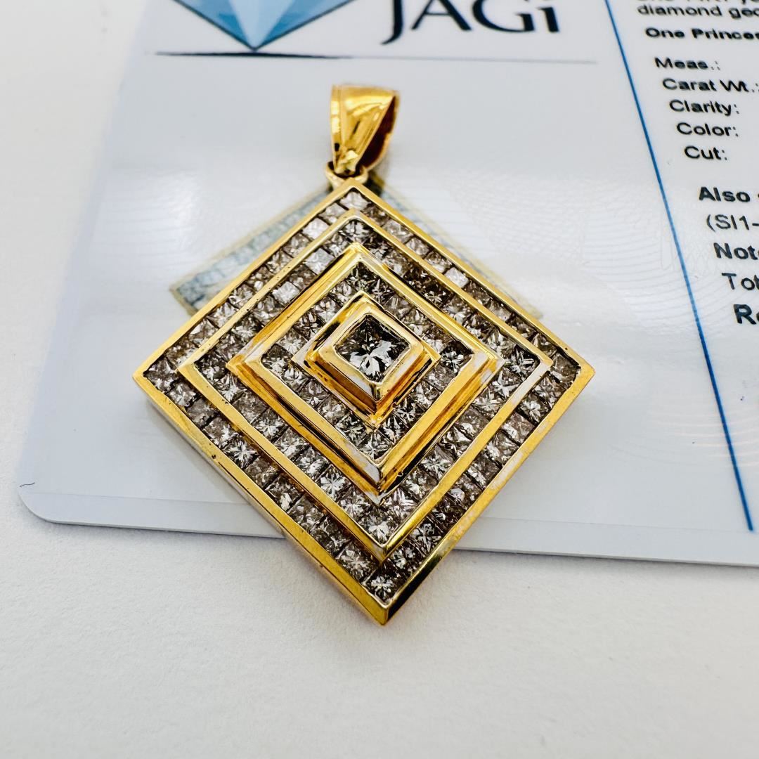 With a hypnotic step-like design, this striking pendant radiates modern elegance. Made in 14KT yellow gold, it showcases a center princess cut diamond weighing 0.17 carats (I-1 clarity, G color), surrounded by 92 princess cut diamonds totaling 2.42 cttw (SI1-I1 clarity, G-H color). The total weight of the item is 8.000 grams.