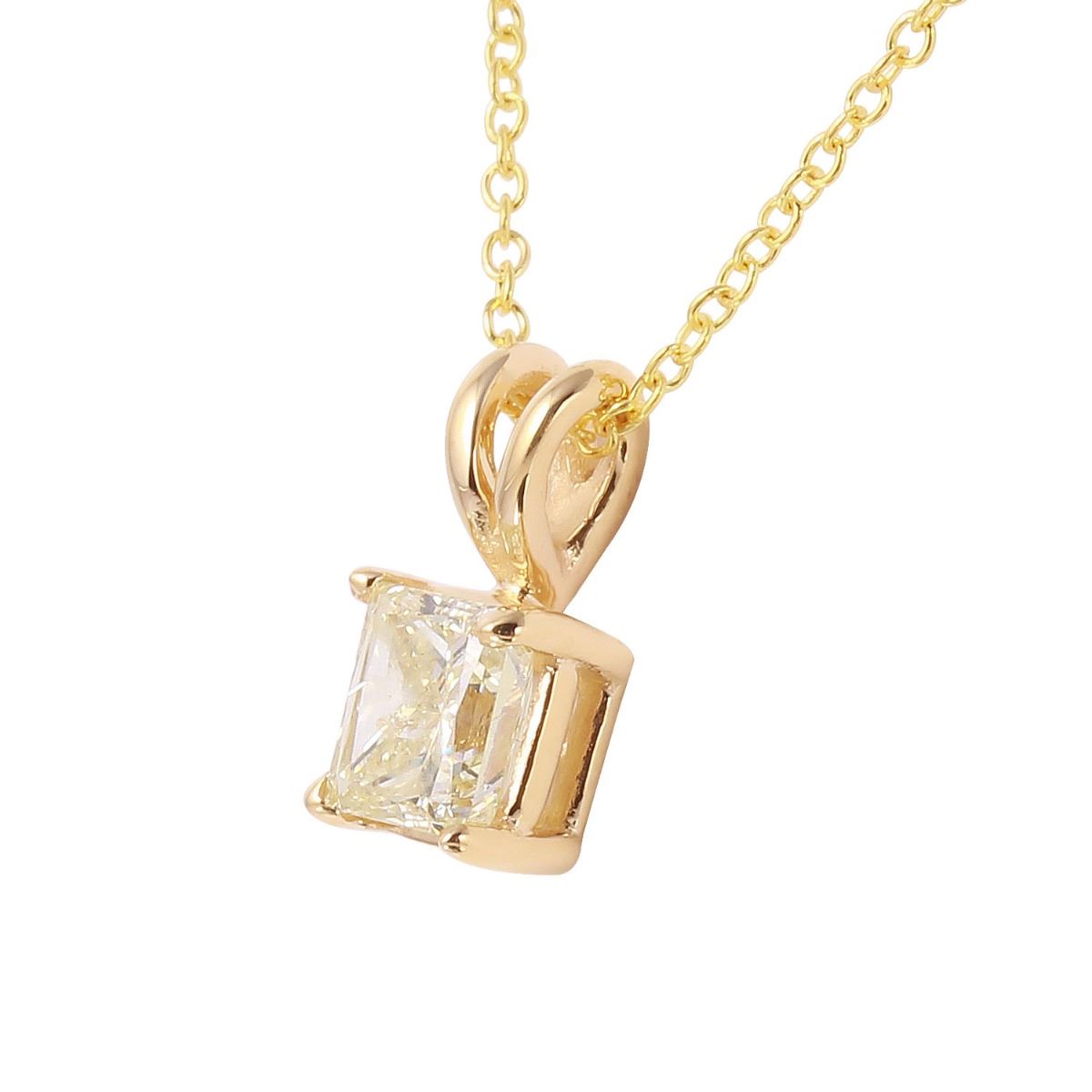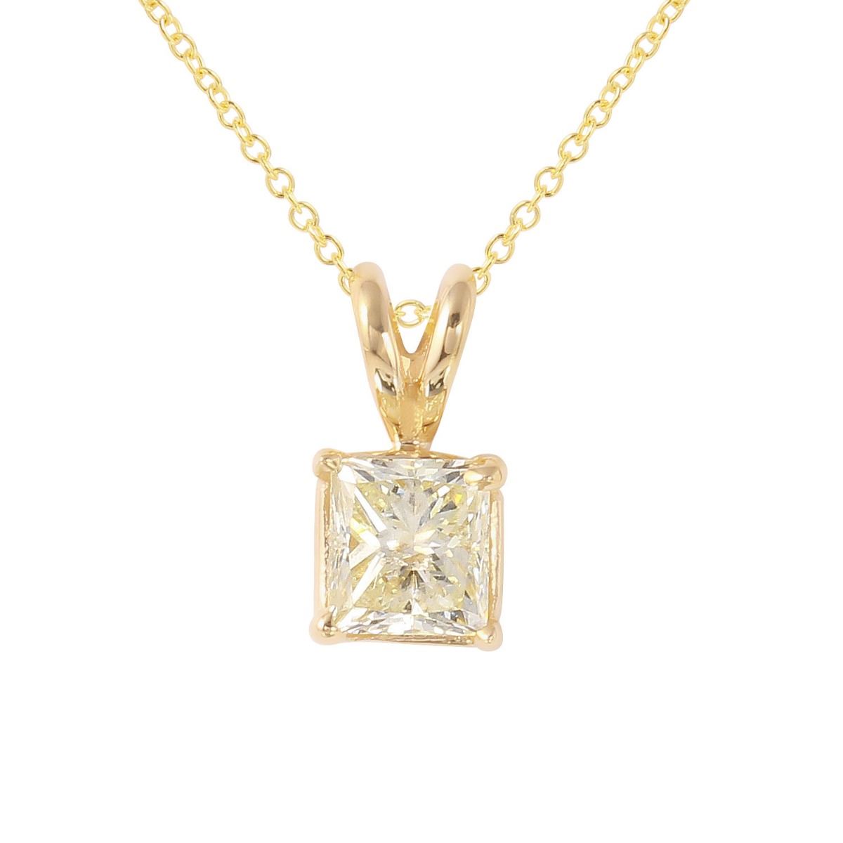 One electronically tested 14KT yellow gold ladies combination cast & assembled diamond pendant & chain 16.0" long, thin oval shape link with a spring ring clasp with a bright polish finish. Condition is new. Containing: One prong set princess cut diamond, measuring 4.65 x 4.65 x 3.70mm (depth est.) approximate weight of 0.77ct. Clarity: SI-2, Cut is Very Good. Approximate Total Weight of Diamonds 0.77ct. Total Weight of Pendant & Chain 1.70gm. The descriptions listed should not be construed as an appraisal. The detail is provided as a guideline for color, clarity, weights and measurements to the best of our ability. We welcome inspections. WE SHIP WORLDWIDE!