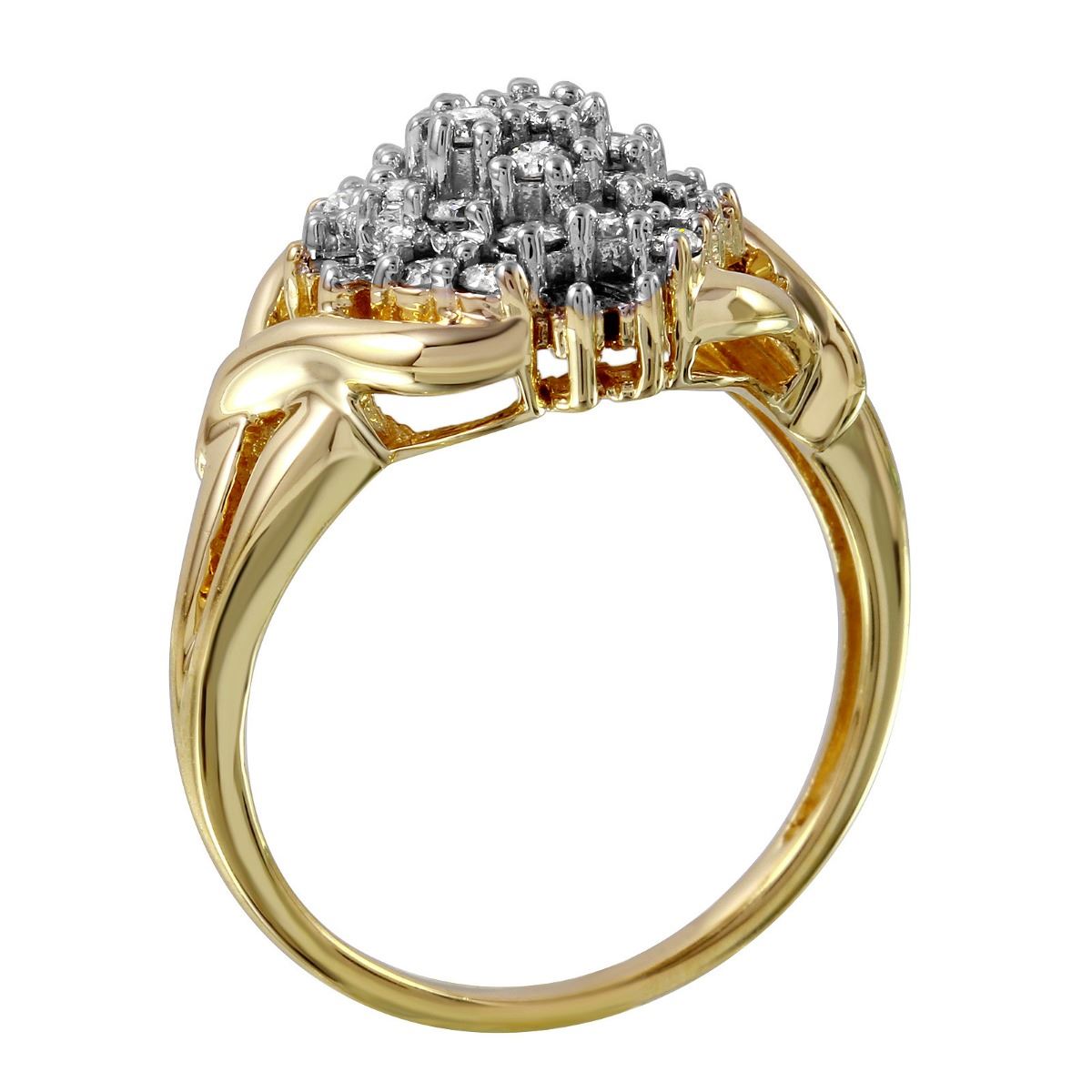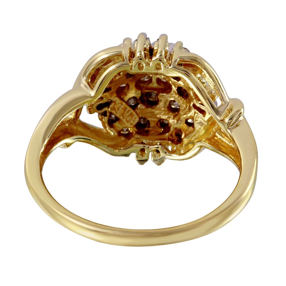 Crafted in brightly polished 14KT yellow gold, this cocktail ring features a mixtures of baguette and round brilliant cut diamonds set in a circular cluster style setting, accented with white gold. The diamonds sit in an open design setting on split style shank, tapering into a slim band.SpecificationsJewelry InformationCategory: RingCategory Style: CocktailNew/Used: Pre-OwnedGender: FemaleRing Size: 7.25Metal: 14KT Yellow GoldTotal Weight: 3.54 GramsTotal Diamond Weight: 0.75ctwTotal Weight all Stones: 0.75ctwInternal ID:147Diamond 1Total Carat Weight: 0.21ctwClarity: I2Color: MShape: Baguette CutCount: 8Diamond 2Total Carat Weight: 0.54ctwClarity: I2Color: L-MShape: Round Brilliant CutCount: 21DisclaimersThe descriptions listed should not be construed as an appraisal. The detail is provided as a guideline for color, clarity, weights and measurements to the best of our ability. We welcome inspections. WE SHIP WORLDWIDE!This item has a Reserve established by our consigner.