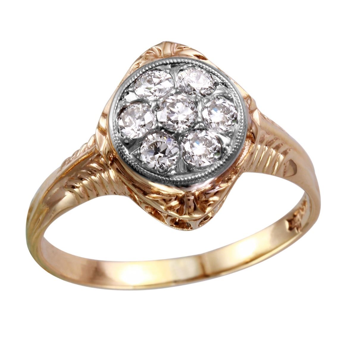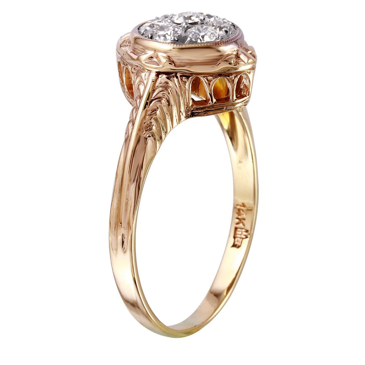 One stamped & tested 14KT yellow gold ladies hand made diamond ring with a flat shank with a bright polish with filigree design finish. Size 7 (sizeable). Identified with markings of "14K". Condition is very good. Containing: One prong set Old European cut diamond, measuring 2.60 - 2.60 x 1.61mm (depth est.) approximate weight of 0.10ct. Clarity: VS-2. Color: G, Cut is Very Good. Six prong set transitional cut diamonds, measuring 2.50 - 2.50 x 1.55mm (depth est.) approximate total weight of 6 Stones = 0.35ct. Clarity: VS-2. Color: G - H, Cut is Very Good. Approximate Total Weight of Diamonds 0.45ct. Total Weight of Ring 2.86gm. The descriptions listed should not be construed as an appraisal. The detail is provided as a guideline for color, clarity, weights and measurements to the best of our ability. We welcome inspections. WE SHIP WORLDWIDE!