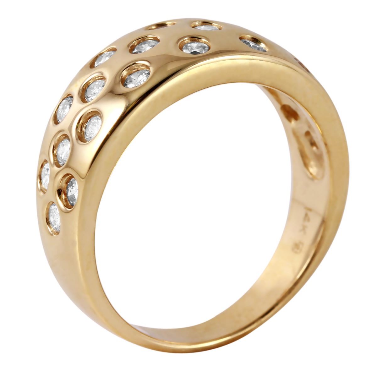 This ring is created in a graduated size design, tapering into a smaller width at the bottom, finished with flattened edges. Round brilliant cut diamonds adorn the top in flush settings, all in brightly polished 14KT yellow gold.SpecificationsJewelry InformationCategory: RingCategory Style: DiamondNew/Used: Pre-OwnedGender: FemaleRing Size: 7.25Metal: 14KT Yellow GoldTotal Weight: 7.05 GramsTotal Diamond Weight: 0.91ctwTotal Weight all Stones: 0.91ctwInternal ID:89Diamond 1Total Carat Weight: 0.91ctwClarity: SI2-I2Color: H-IShape: Round Brilliant CutCount: 21DisclaimersThe descriptions listed should not be construed as an appraisal. The detail is provided as a guideline for color, clarity, weights and measurements to the best of our ability. We welcome inspections. WE SHIP WORLDWIDE!This item has a Reserve established by our consigner.