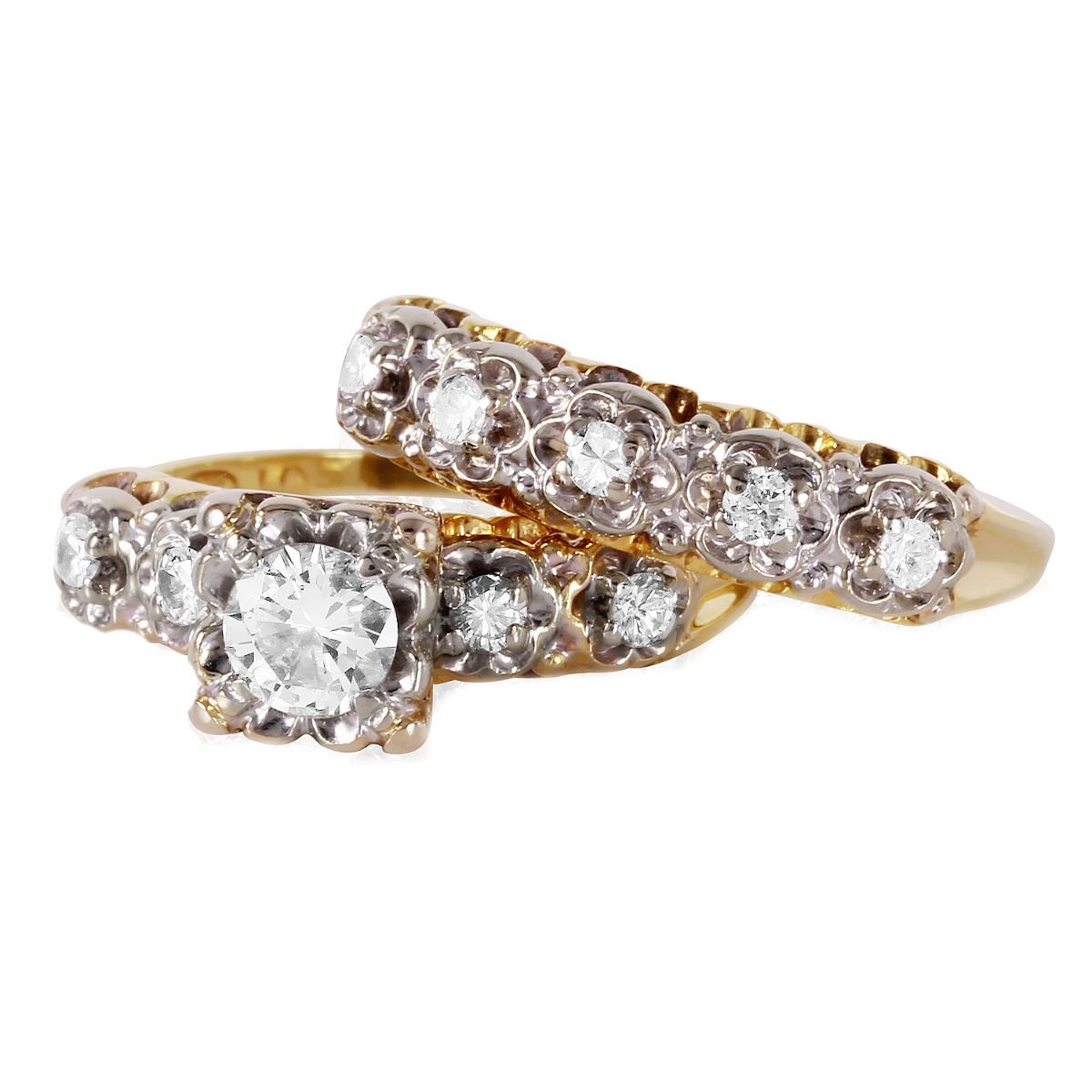 This matching wedding ring set features an engagement ring with one round brilliant cut diamond prong set in a raised square shaped setting, with round brilliant cut diamond accent side stones. The matching wedding band contains round brilliant cut diamonds prong set along the top. Diamonds are set in a white gold accented filigree style setting on brightly polished 14KT yellow gold bands.SpecificationsJewelry InformationCategory: RingCategory Style: Wedding Ring SetNew/Used: Pre-OwnedGender: FemaleRing Size: 5Metal: 14KT Yellow GoldTotal Weight: 5.18 GramsTotal Diamond Weight: 0.49ctwTotal Weight all Stones: 0.49ctwInternal ID:375Diamond 1Total Carat Weight: 0.33ctwClarity: VS2Color: GShape: Round Brilliant CutCount: 1Diamond 2Total Carat Weight: 0.16ctwClarity: SI1Color: I-JShape: Round Brilliant CutCount: 9DisclaimersThe descriptions listed should not be construed as an appraisal. The detail is provided as a guideline for color, clarity, weights and measurements to the best of our ability. We welcome inspections. WE SHIP WORLDWIDE!This item has a Reserve established by our consigner.