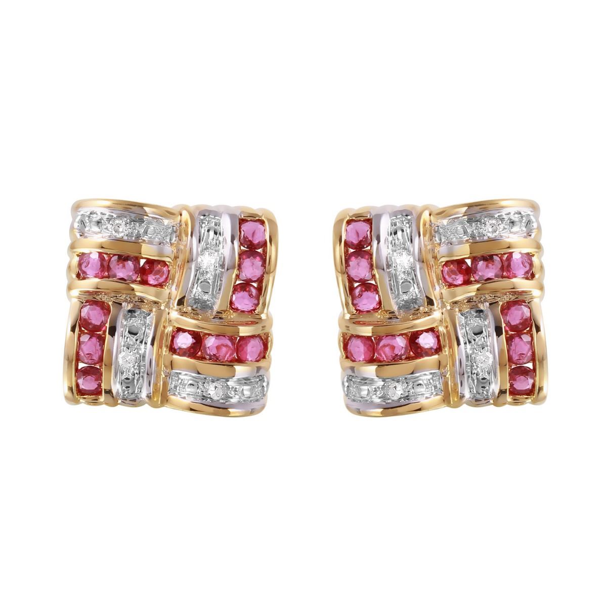 14KT yellow gold Diamond and Ruby Stud Earrings. Square shaped studs feature alternating rows of twenty four rubies with round diamond accents, channel set, finished with post friction backs. Total weight: 4.20 grams. The descriptions listed should not be construed as an appraisal. The detail is provided as a guideline for color, clarity, weights and measurements to the best of our ability. We welcome inspections. WE SHIP WORLDWIDE!