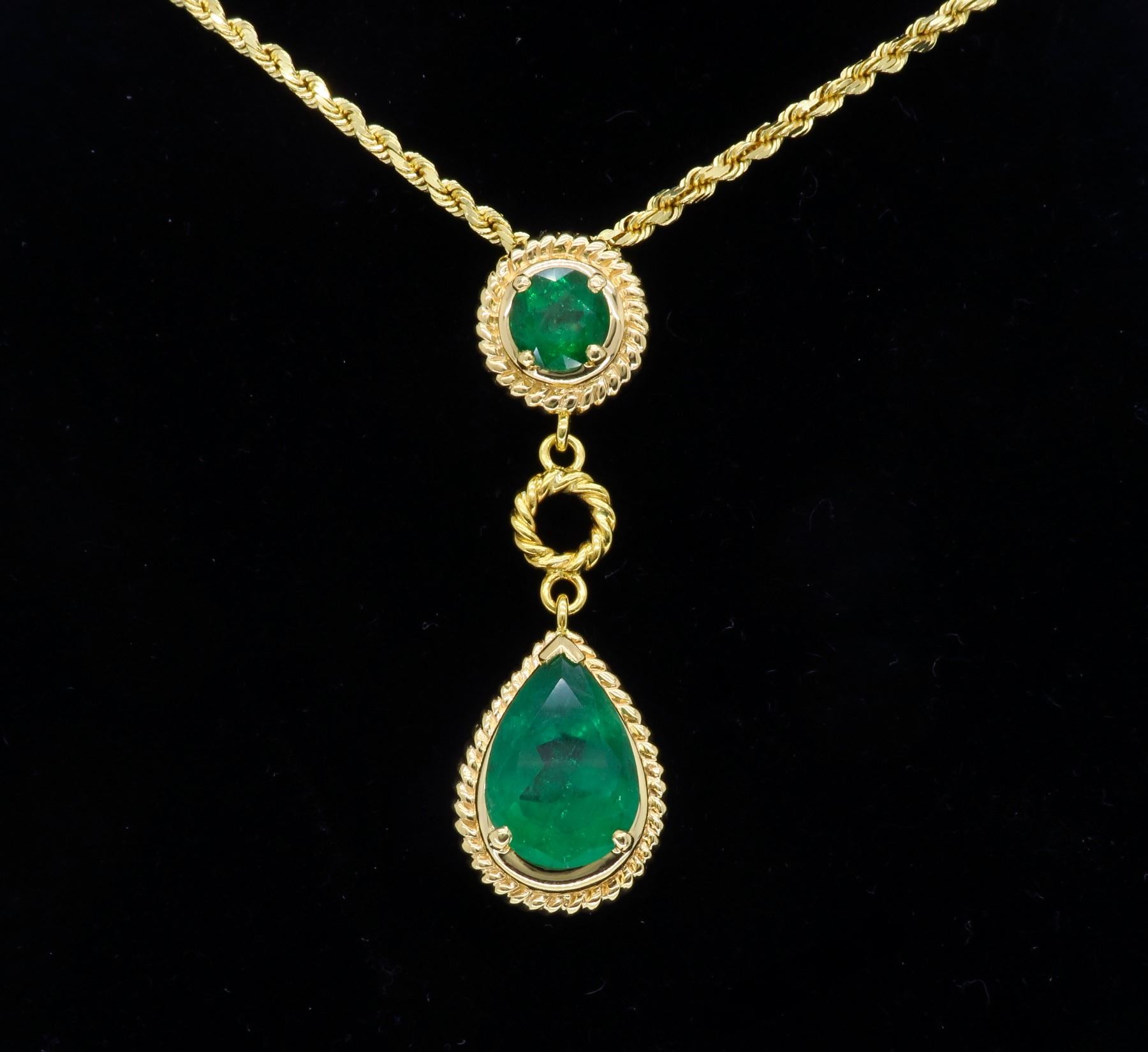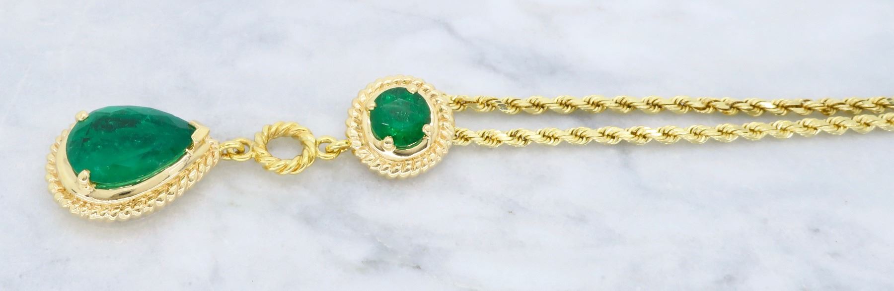 One 14KT Yellow Gold Emerald Pendant with Chain. (1) pear shaped emerald with dimensions of 10.39MM x 14.50MM. (1) round emerald measuring 7.1MM. Total weight of this pendant with chain is 22.8 grams.