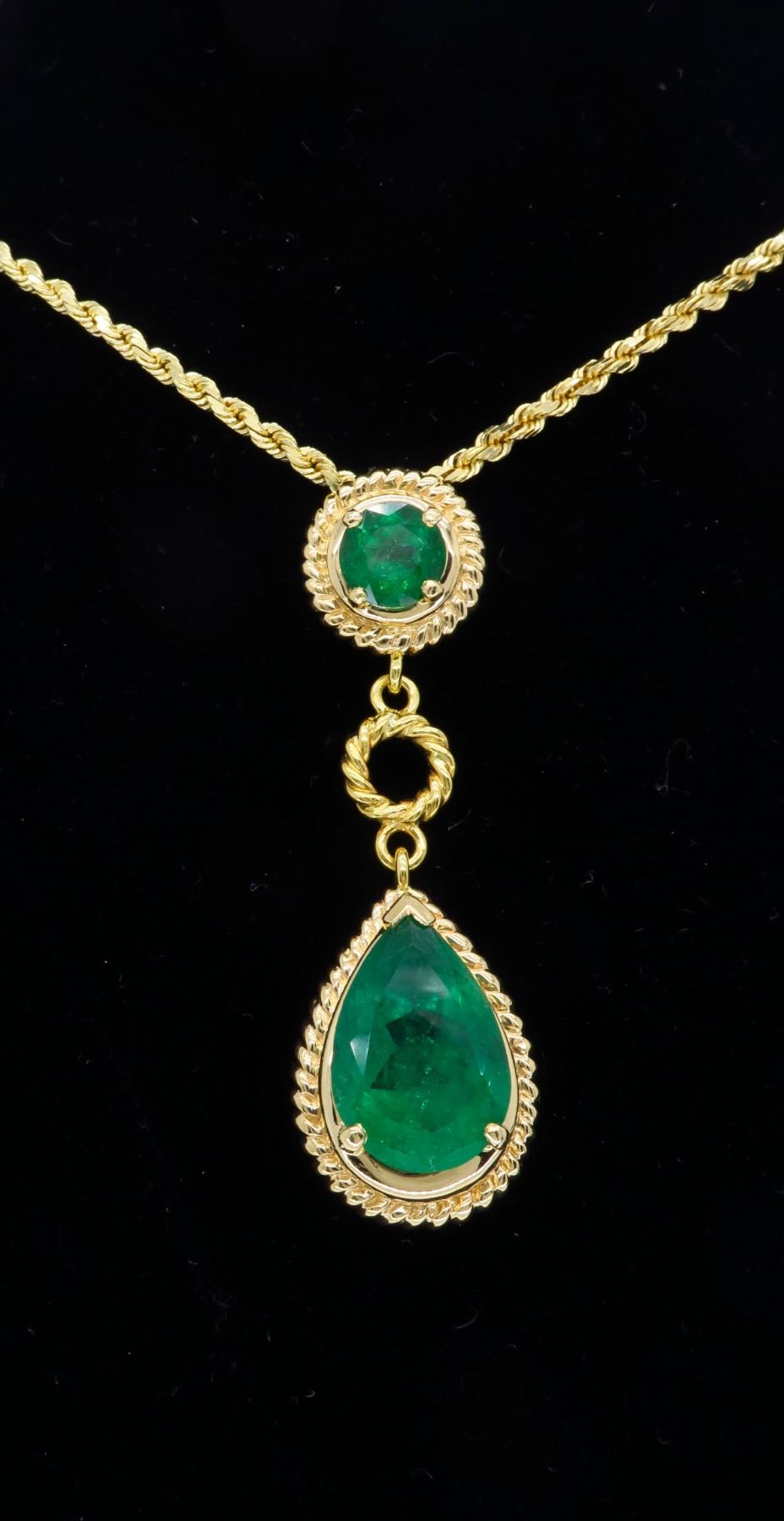 One 14KT Yellow Gold Emerald Pendant with Chain. (1) pear shaped emerald with dimensions of 10.39MM x 14.50MM. (1) round emerald measuring 7.1MM. Total weight of this pendant with chain is 22.8 grams.