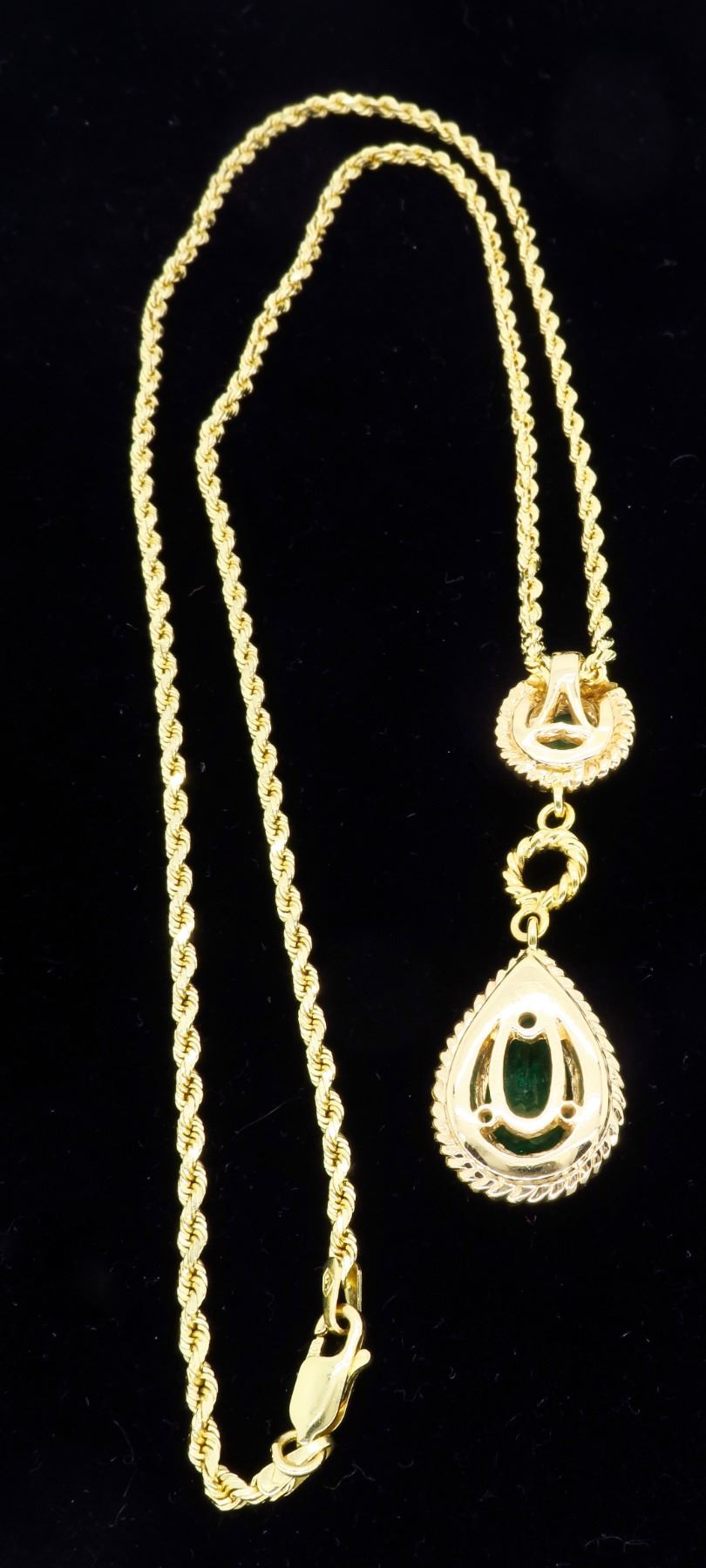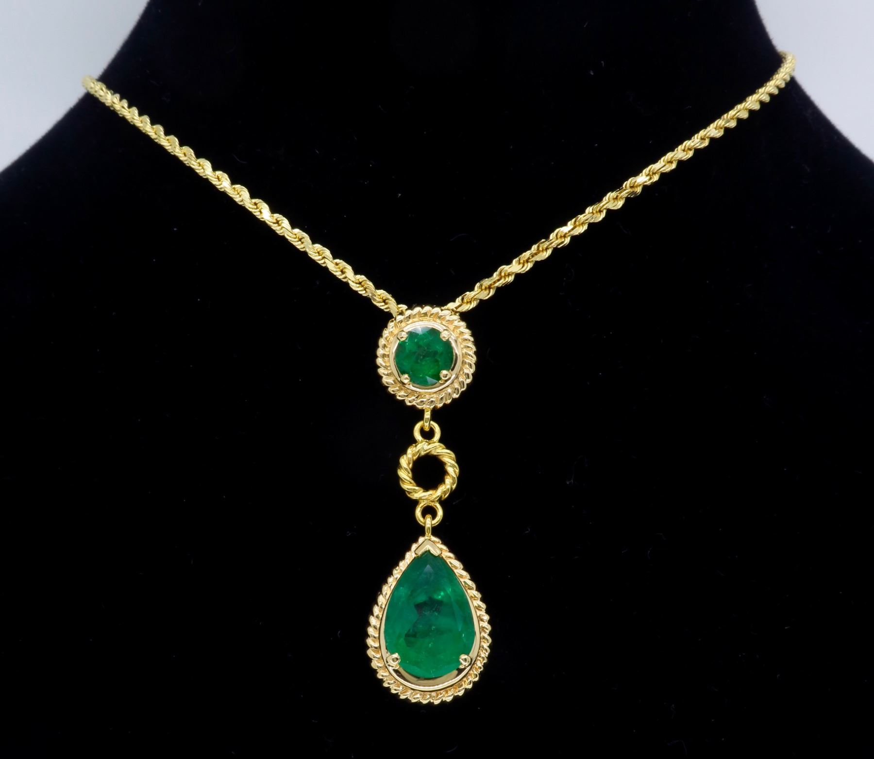 One 14KT Yellow Gold Emerald Pendant with Chain. (1) pear shaped emerald with dimensions of 10.39MM x 14.50MM. (1) round emerald measuring 7.1MM. Total weight of this pendant with chain is 22.8 grams.