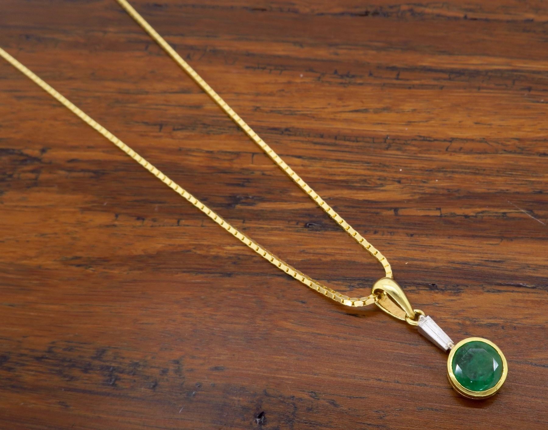 One 14KT Yellow Gold Emerald and Diamond Pendant with Chain. (1) Vivid Green Emerald with a measurement of 6.75mm. (1) Tapered Baguette Diamond with a total weight of 0.10cts. Total weight of this pendant with chain is 5.4 grams. Total length of this chain is 16 inches.