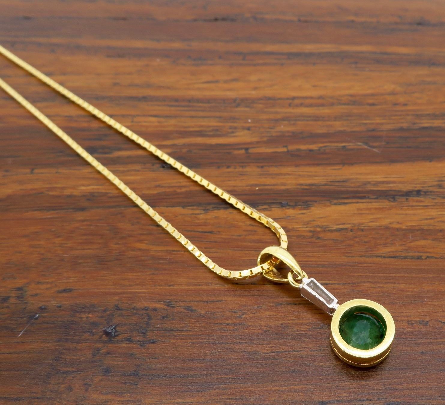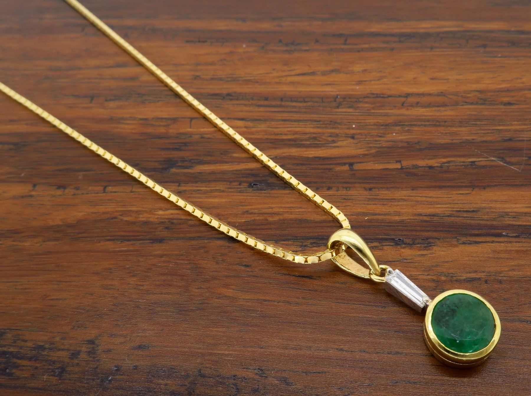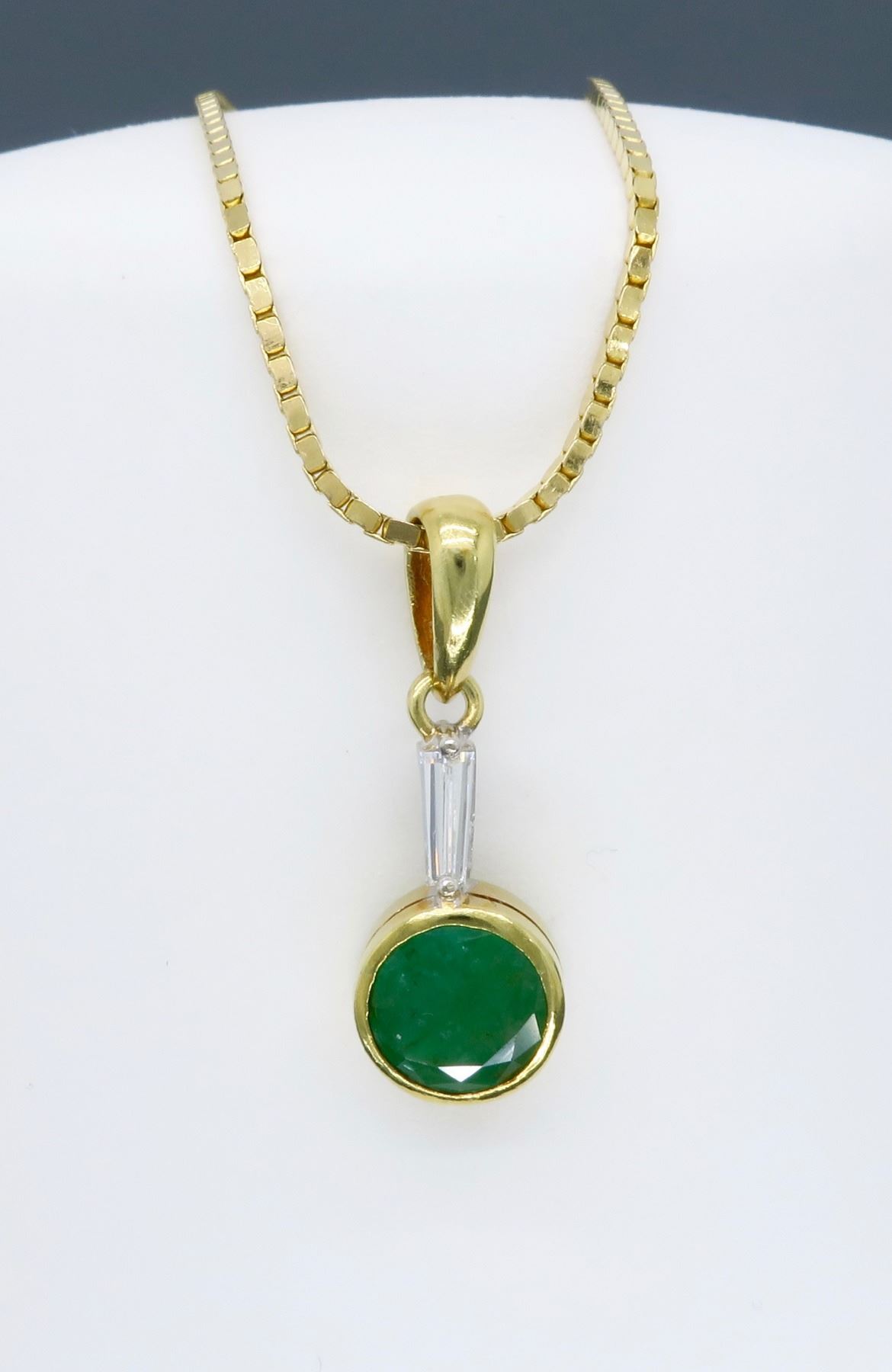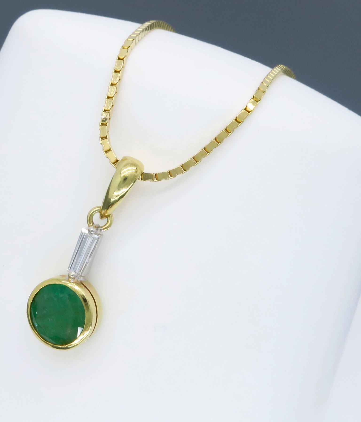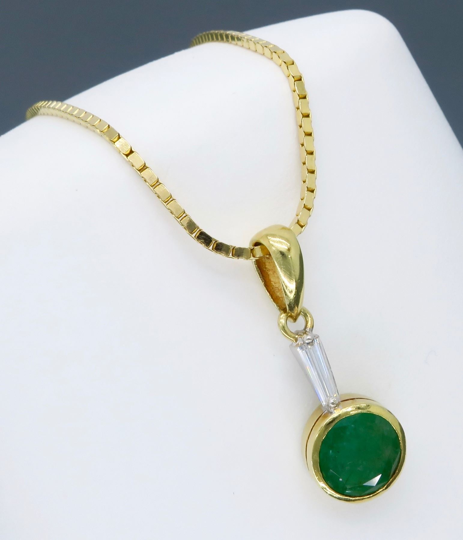 One 14KT Yellow Gold Emerald and Diamond Pendant with Chain. (1) Vivid Green Emerald with a measurement of 6.75mm. (1) Tapered Baguette Diamond with a total weight of 0.10cts. Total weight of this pendant with chain is 5.4 grams. Total length of this chain is 16 inches.