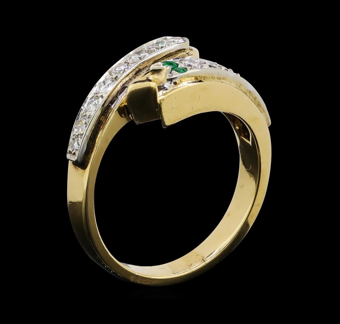 One 14KT Yellow Gold 0.02ctw Emerald and Diamond Ring. Total weight of emerald is 0.02cts. Total weight of diamonds is 0.65cts. Total weight of the ring is 5.29 grams.