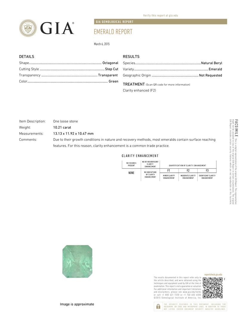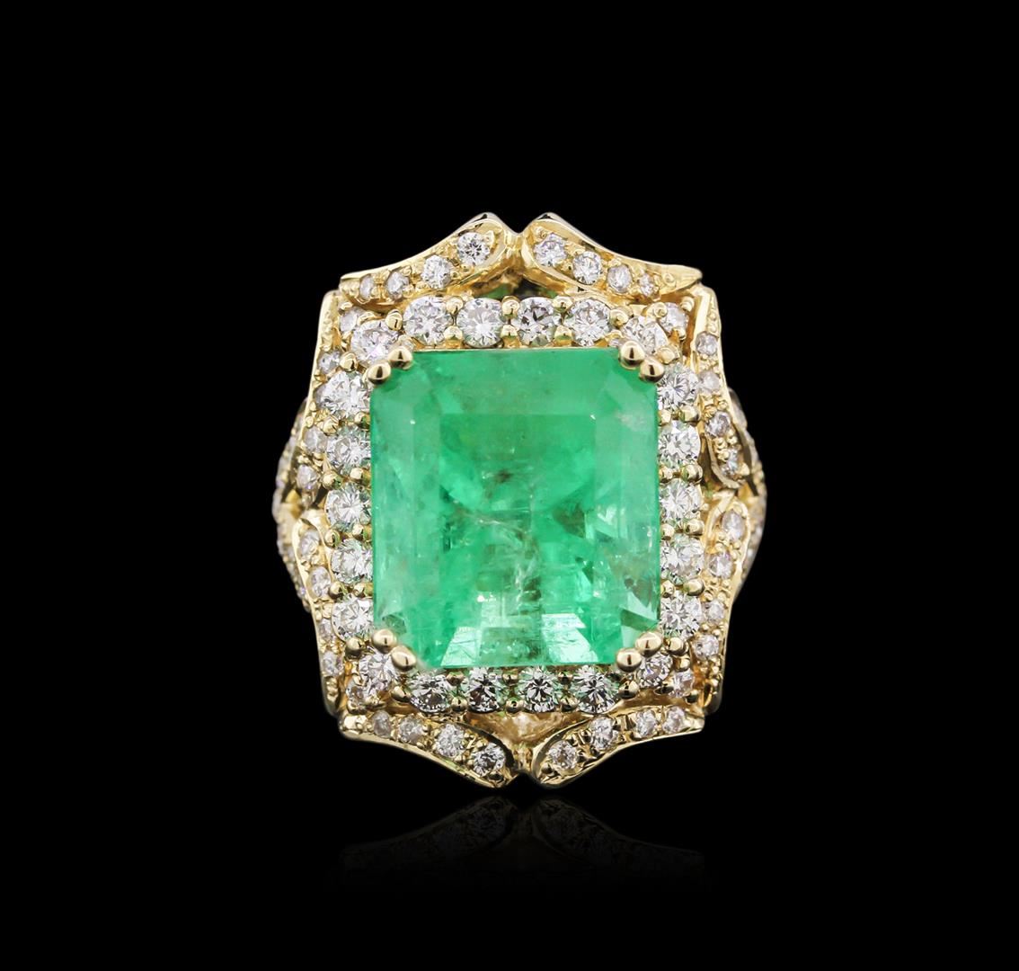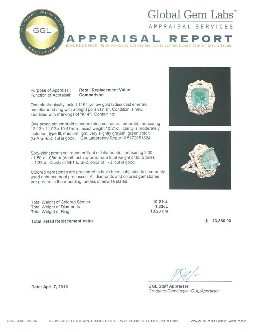 One electronically tested 14KT yellow gold ladies cast emerald and diamond ring with a bright polish finish. Identified with markings of "K14". Condition is new. Containing: One prong set emerald standard step cut natural emerald, measuring 13.13 x 11.92 x 10.47mm, exact weight 10.21ct., clarity is moderately included, type III, medium light, very slightly grayish, green color, (GIA G 4/3), cut is good. GIA Laboratory Report # 5172051824.Sixty-Eight prong set round brilliant cut diamonds, measuring 2.00. - 1.50 x 1.05mm (depth est.) approximate total weight of 68 Stones = 1.33ct. Clarity: SI-1 to SI-2. Color: I - J, Cut is Good. Colored gemstones are presumed to have been subjected to commonly used enhancement processes. All diamonds and colored gemstones are graded in the mounting, unless otherwise stated. Total Weight of Colored Stones 10.21ct. Total Weight of Diamonds 1.33ct. Total Weight of Ring 13.20 grams. GGL Appraised at $13,860.00.