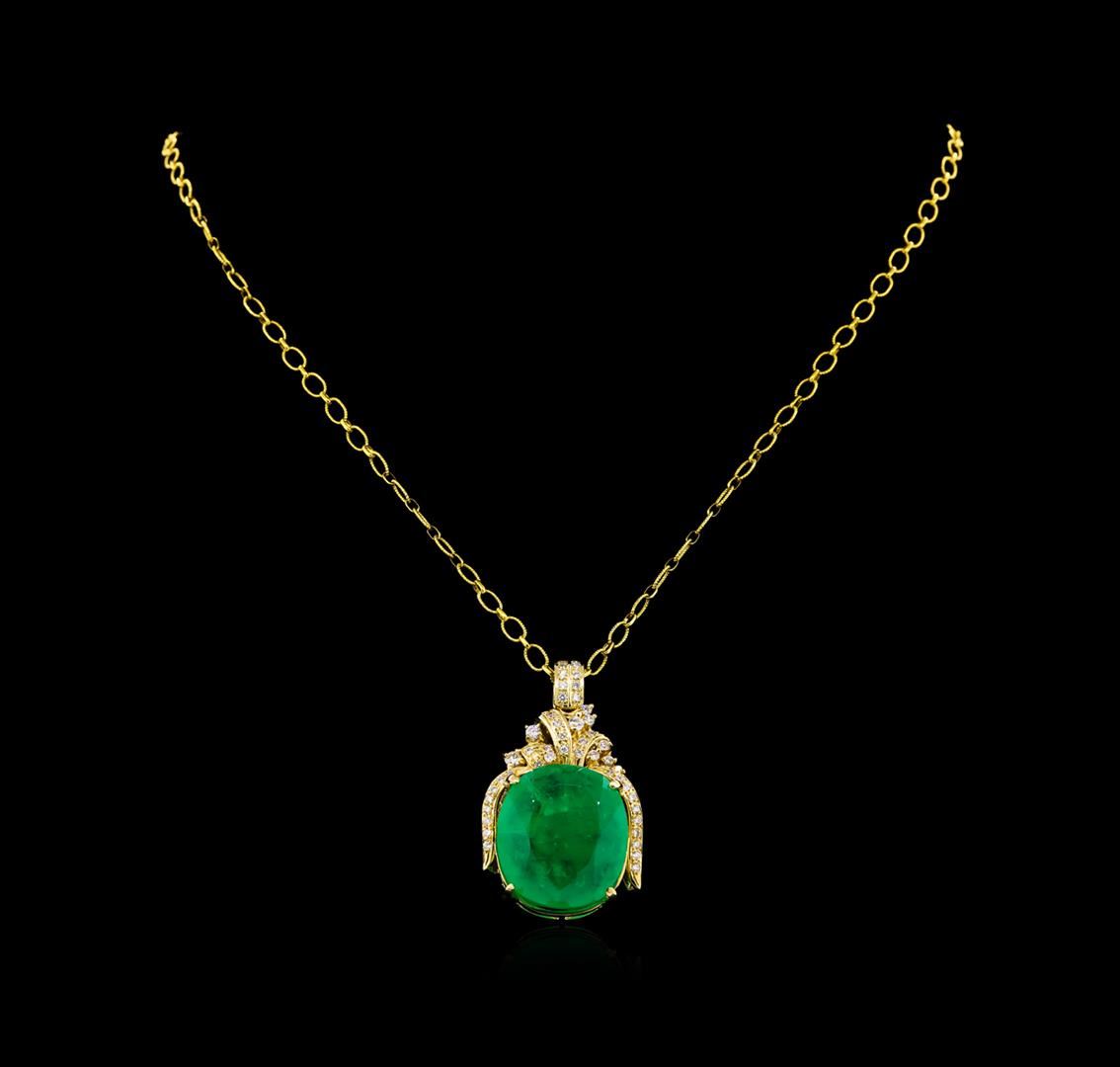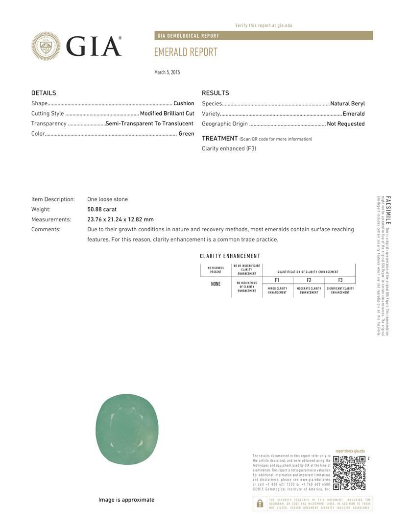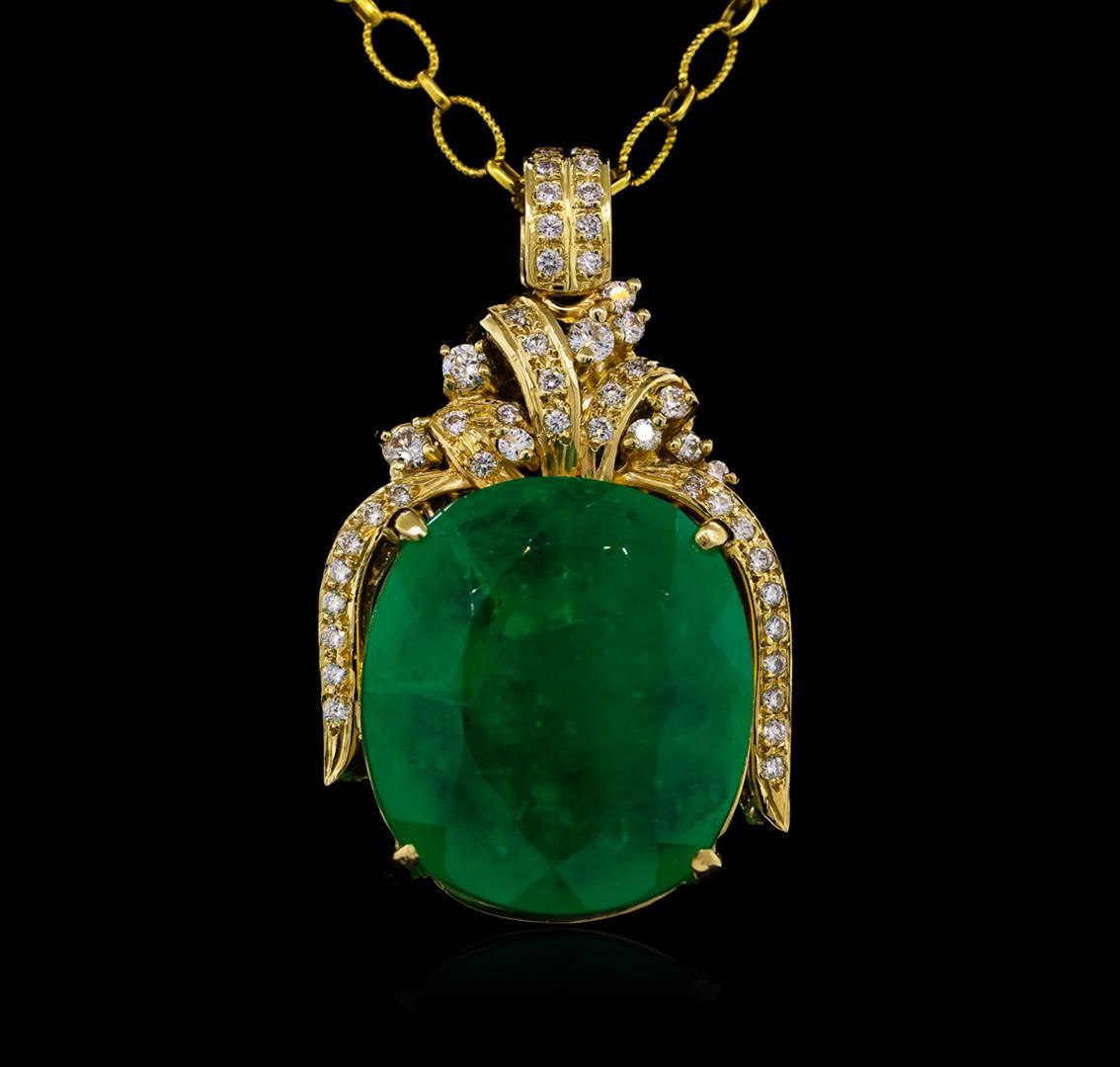 One electronically tested 14KT yellow gold ladies combination cast & assembled emerald and diamond pendant & chain 20.0" long, light oval link with a lobster claw clasp with a bright polish finish. Identified with markings of "14K". Condition is new. Containing: One prong set square cushion modified brilliant cut natural emerald, measuring 23.76 x 21.24 x 12.82mm, exact weight 50.88ct., clarity is severely included, type III, medium, very slightly grayish, green color, (GIA G 5/3), cut is good. Graded loose by GIA. GIA Gem Trade Laboratory Report #1172051917.Forty-Six prong set round brilliant cut diamonds, measuring 1.50 - 1.50 x 0.90mm (depth est.) approximate total weight of 46 Stones = 0.57ct. Clarity: SI-1. Color: J - K, Cut is Good. Three prong set round brilliant cut diamonds, measuring 2.50 - 2.50 x 1.50mm (depth est.) approximate total weight of 3 Stones = 0.17ct. Clarity: VS-2. Color: J - K, Cut is Good. Due to their growth conditions in nature and recovery methods, most emeralds contain surface reaching features. For this reason, clarity enhancement is a common trade practice. Diamonds are graded in the mounting, unless otherwise stated. Total Weight of Colored Stones 50.88ct. Total Weight of Diamonds 0.74ct. Total Weight of Pendant & Chain 26.50 grams. GGL Appraised at $29,855.00.