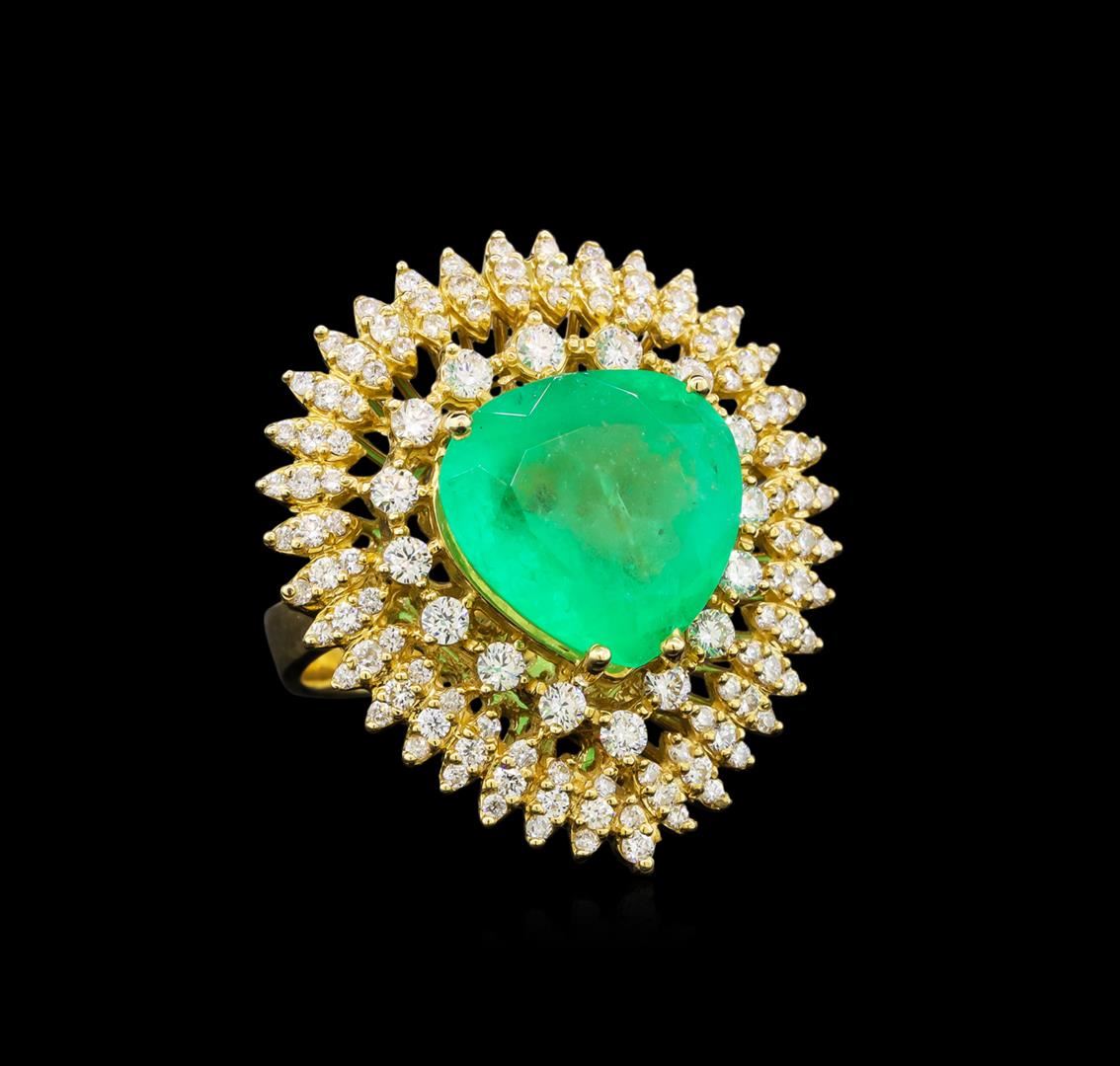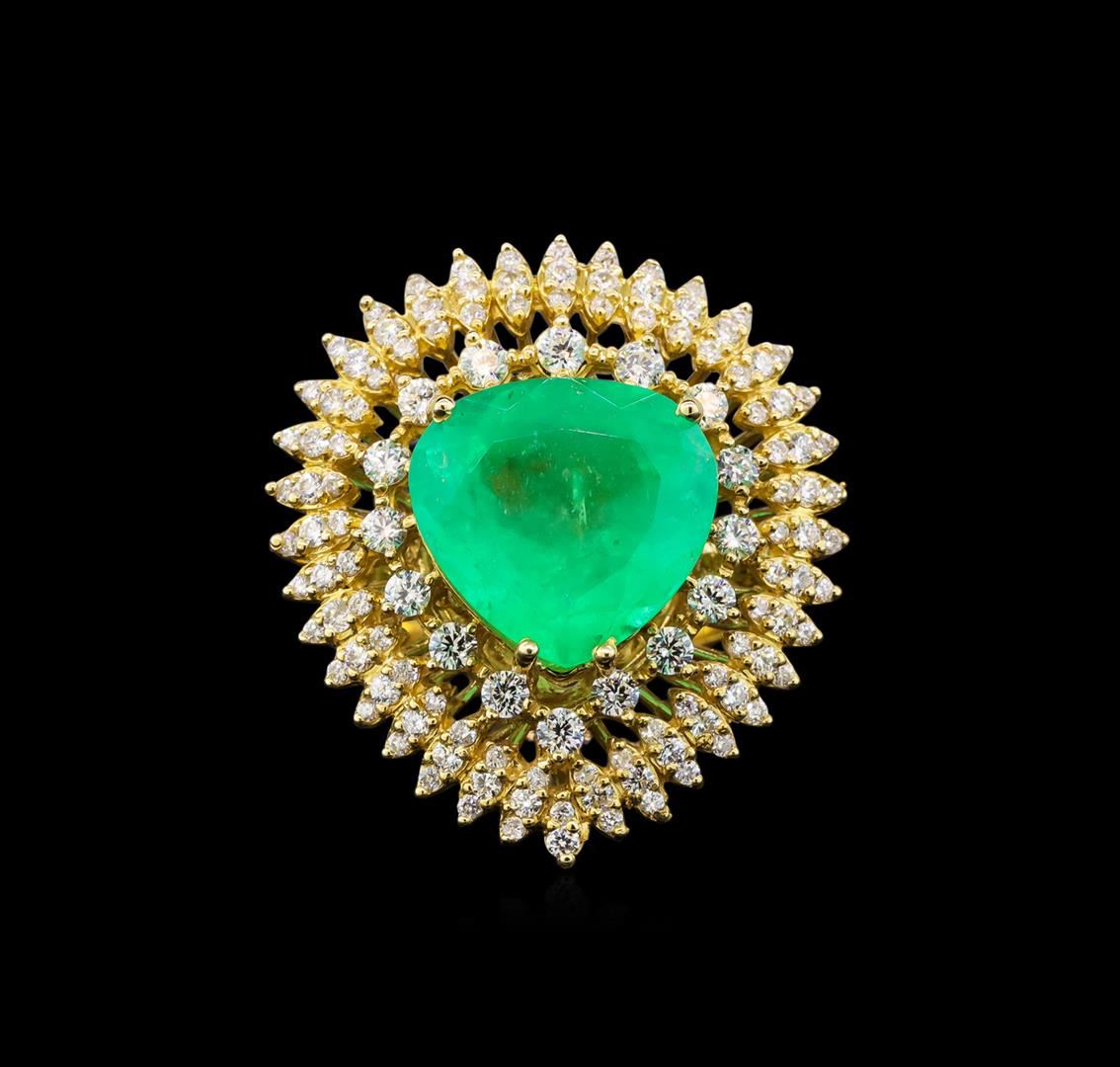 One electronically tested 14KT yellow gold ladies cast emerald and diamond ring with a bright polish finish. Identified with markings of "K14". Condition is new. Containing: One prong set pear modified brilliant cut natural emerald, measuring 13.30 x 13.92 x 7.69mm, exact weight 7.47ct., clarity is heavily included, type III, medium light, very slightly grayish, very slightly bluish green color, (GIA vslbG 4/3) Graded loose prior to setting by GIA Gemological Laboratory. GIA report: 2175049264.One Hundred Twenty-Six prong set round brilliant cut diamonds, measuring 1.90 - 1.20 x 0.93mm (depth est.) approximate total weight of 126 Stones = 1.52ct. Clarity: SI-1. Color: I - J, Cut is Good. Colored gemstones are presumed to have been subjected to commonly used enhancement processes. All diamonds and colored gemstones are graded in the mounting, unless otherwise stated. Total Weight of Colored Stones 7.47ct. Total Weight of Diamonds 1.52ct. Total Weight of Ring 12.30 grams. GGL Appraised at $13,130.00.