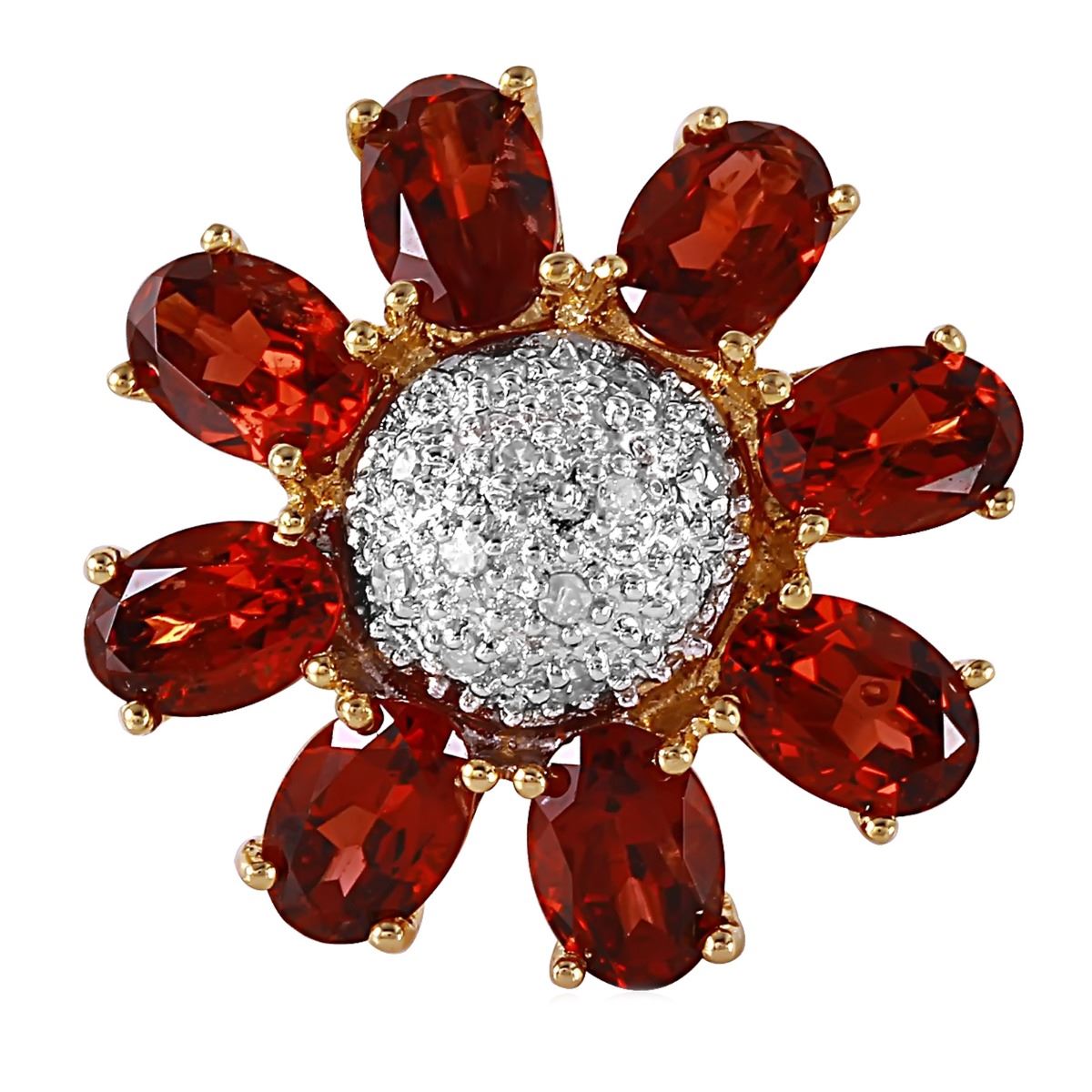 One electronically tested 14KT yellow gold ladies cast garnet and diamond ring with a bright polish finish. Identified with markings of "14K". Condition is very good. Containing: Eight prong set oval modified brilliant cut natural pyrope garnets, measuring 5.50 x 3.50 x 2.28mm, approximate total weight of 2.72ct., clarity is eye clean, type II, medium dark, moderately strong, red color,cut is good. Twelve prong set round brilliant cut diamonds, measuring 1.30 - 1.30 x 0.78mm (depth est.) approximate total weight of 12 Stones = 0.10ct. Clarity: I-1 to I-2. Color: I - J. Approximate Total Weight of Colored Stones 2.72ct. Approximate Total Weight of Diamonds 0.10ct. Total Weight of Ring 5.35gm. Ring Size 6.5. The descriptions listed should not be construed as an appraisal. The detail is provided as a guideline for color, clarity, weights and measurements to the best of our ability. We welcome inspections. WE SHIP WORLDWIDE!