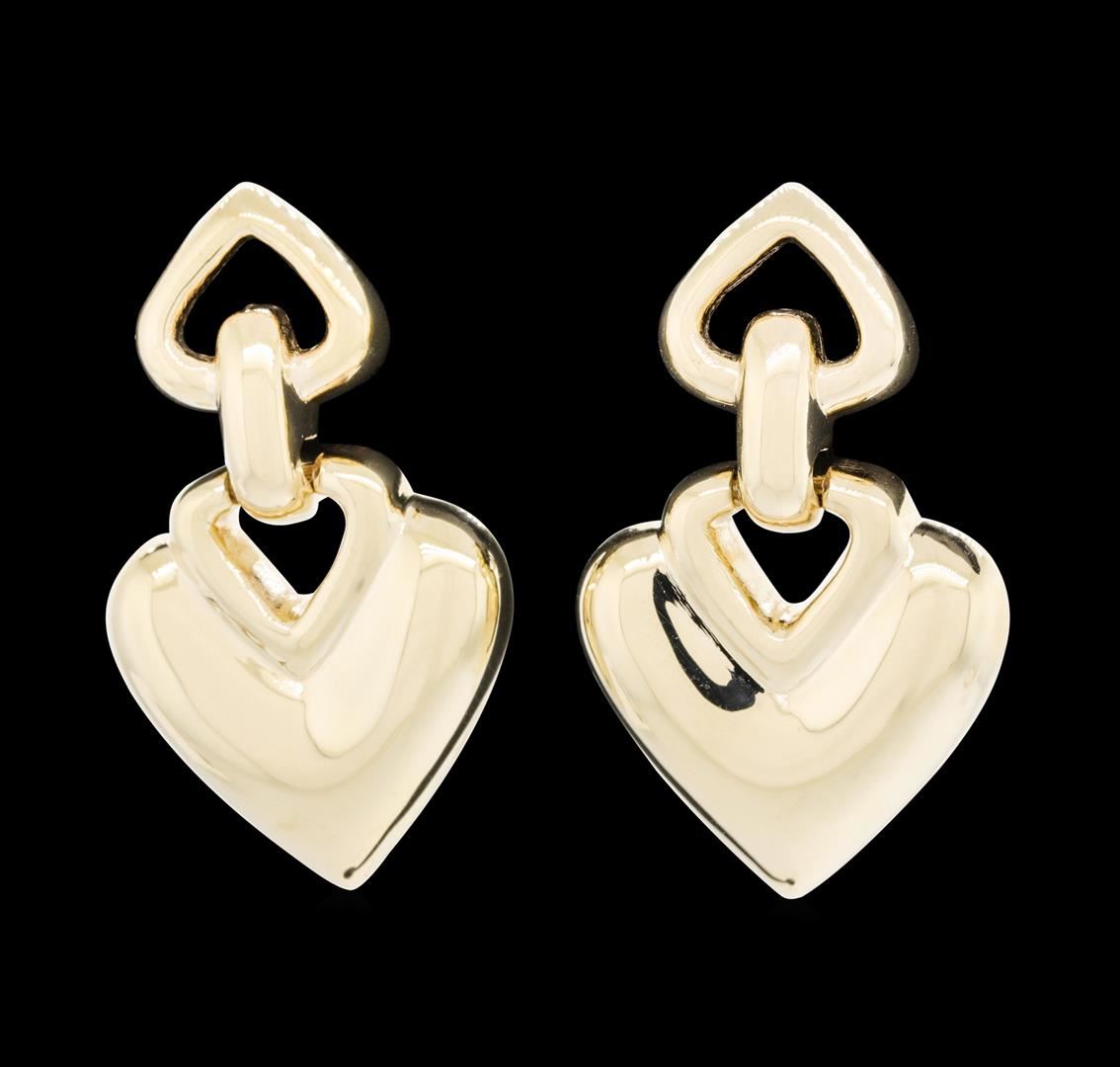 One pair of heart shaped dangle earrings with omega clip backs featuring: 14KT yellow gold weighing 17.4 grams.