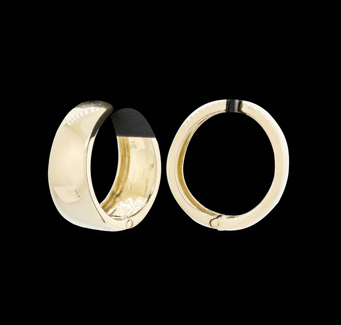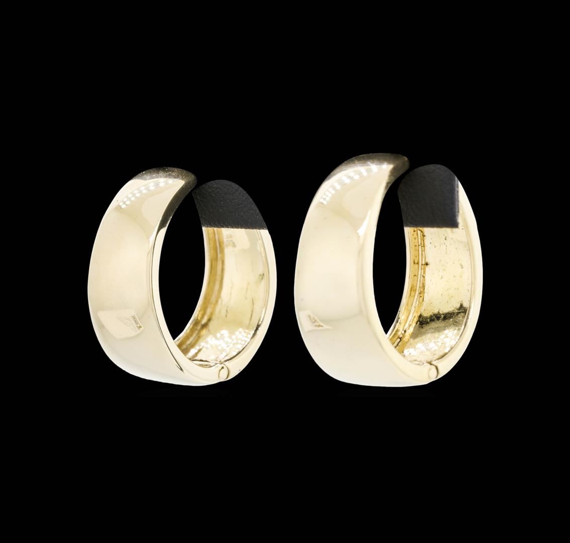 One pair of spring loaded clip hoop earrings featuring: 14KT yellow gold weighing 13.5 grams.