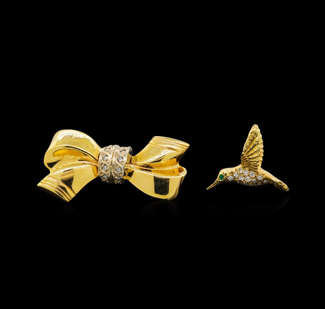 14KT yellow gold hummingbird and ribbon pins weighing a total of 13.30 grams.