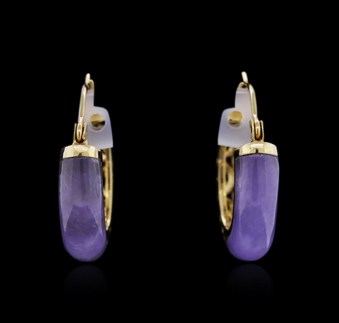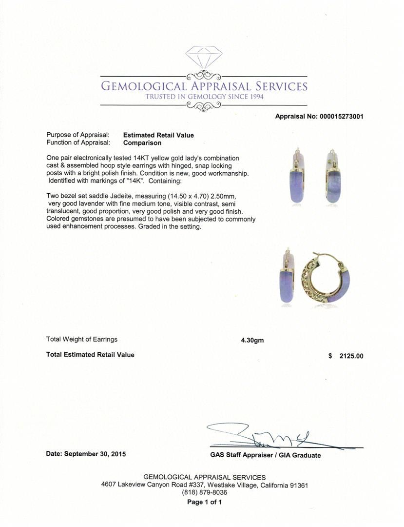 One pair electronically tested 14KT yellow gold lady's combination cast & assembled hoop style earrings with hinged, snap locking posts with a bright polish finish. Identified with markings of "14K". Condition is new, good workmanship. Containing: Two bezel set saddle Jadeite, measuring (14.50 x 4.70) 2.50mm, very good lavender with fine medium tone, visible contrast, semi translucent, good proportion, very good polish and very good finish. Colored gemstones are presumed to have been subjected to commonly used enhancement processes. Graded in the setting. Total Weight of Earrings 4.30gm. GAS Appraised at $2,125.00.