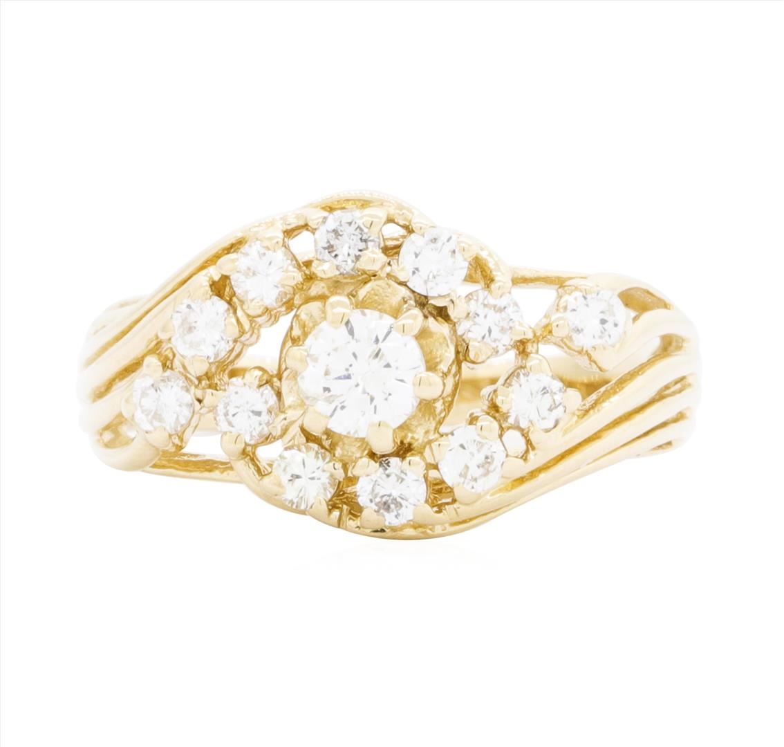 One electronically tested 14KT yellow gold lady's cast fashion ring with a bypass swirl with a bright polish finish. The featured lady's ring has a shank measuring 2.20 millimeters wide. Identified with markings of '14KP'. Condition is used, good workmanship. Containing: One prong set round brilliant cut diamond, measuring 4.15 - 4.10 x 2.53mm (depth est.) approximate weight of 0.26ct. Graded in the setting. Color G - I Clarity I-1 Cut Good Twelve prong set round brilliant cut diamonds, measuring 2.40 - 2.30 x 1.46mm (depth est.) approximate total weight of 12 Stones = 0.60ct. Graded in the setting. Color H - I Clarity SI-1 to SI-2 Cut Good. Total Weight of Diamonds 0.86ct.. Total Weight of Ring 4.20gm GAS Appraised.