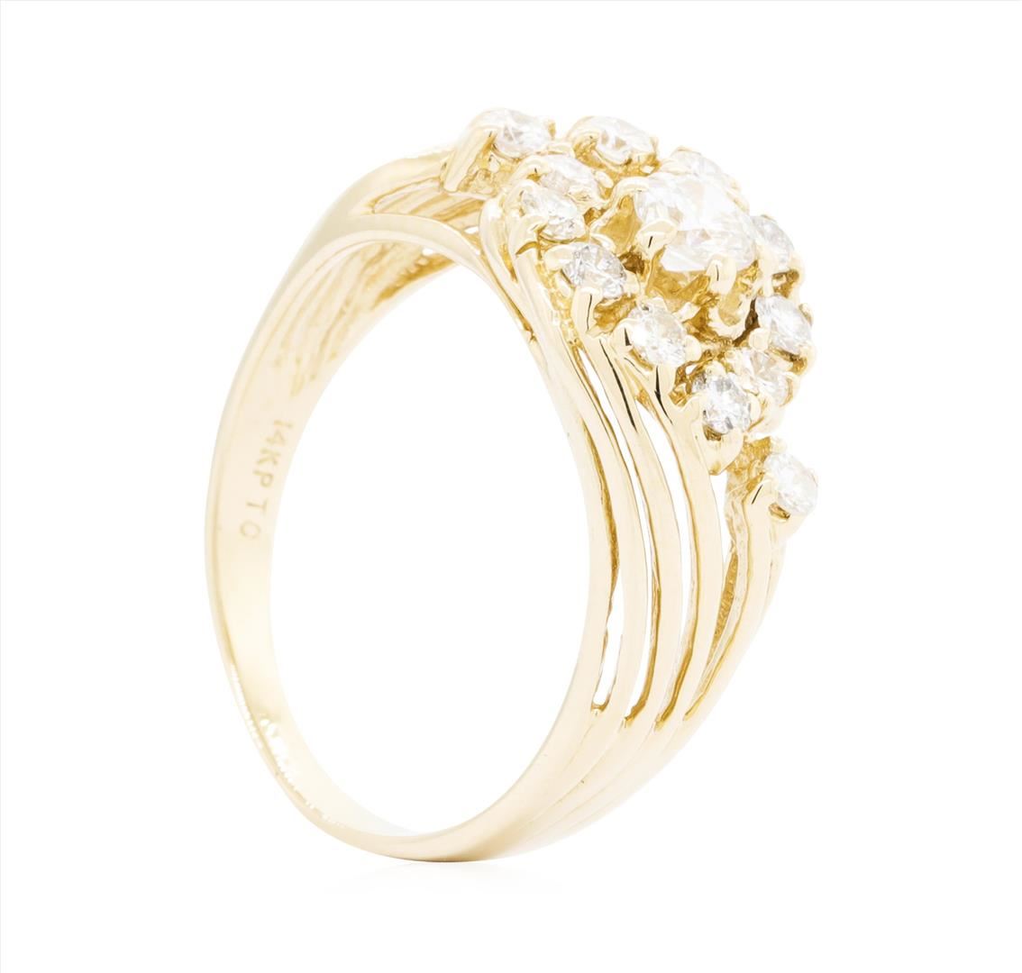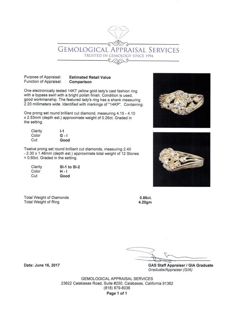 One electronically tested 14KT yellow gold lady's cast fashion ring with a bypass swirl with a bright polish finish. The featured lady's ring has a shank measuring 2.20 millimeters wide. Identified with markings of '14KP'. Condition is used, good workmanship. Containing: One prong set round brilliant cut diamond, measuring 4.15 - 4.10 x 2.53mm (depth est.) approximate weight of 0.26ct. Graded in the setting. Color G - I Clarity I-1 Cut Good Twelve prong set round brilliant cut diamonds, measuring 2.40 - 2.30 x 1.46mm (depth est.) approximate total weight of 12 Stones = 0.60ct. Graded in the setting. Color H - I Clarity SI-1 to SI-2 Cut Good. Total Weight of Diamonds 0.86ct.. Total Weight of Ring 4.20gm GAS Appraised.