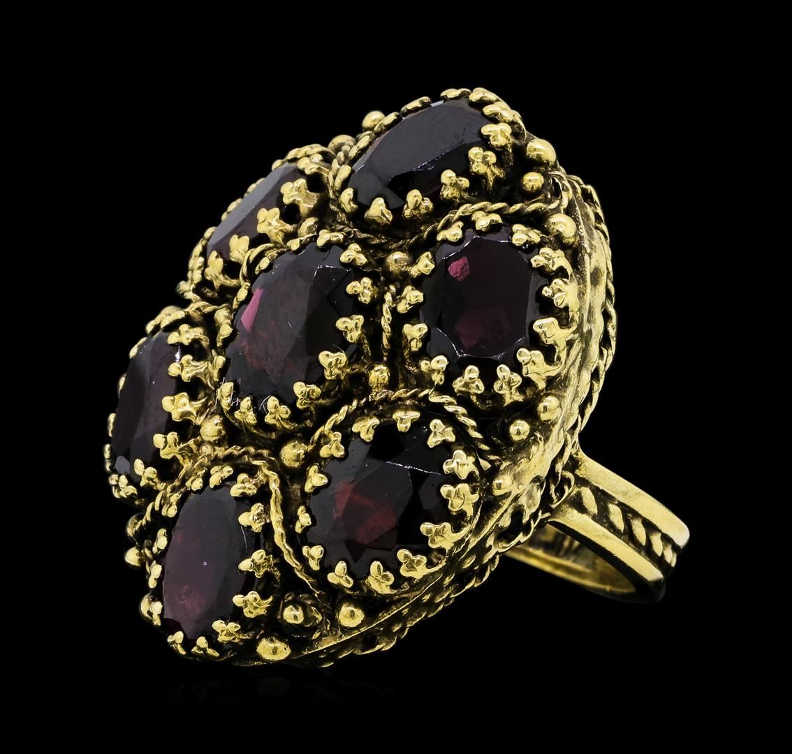 One lady's ring featuring: 14KT yellow gold weighing 13.4 grams containing seven garnets weighing 10.50ctw. The ring is a size 8.5.