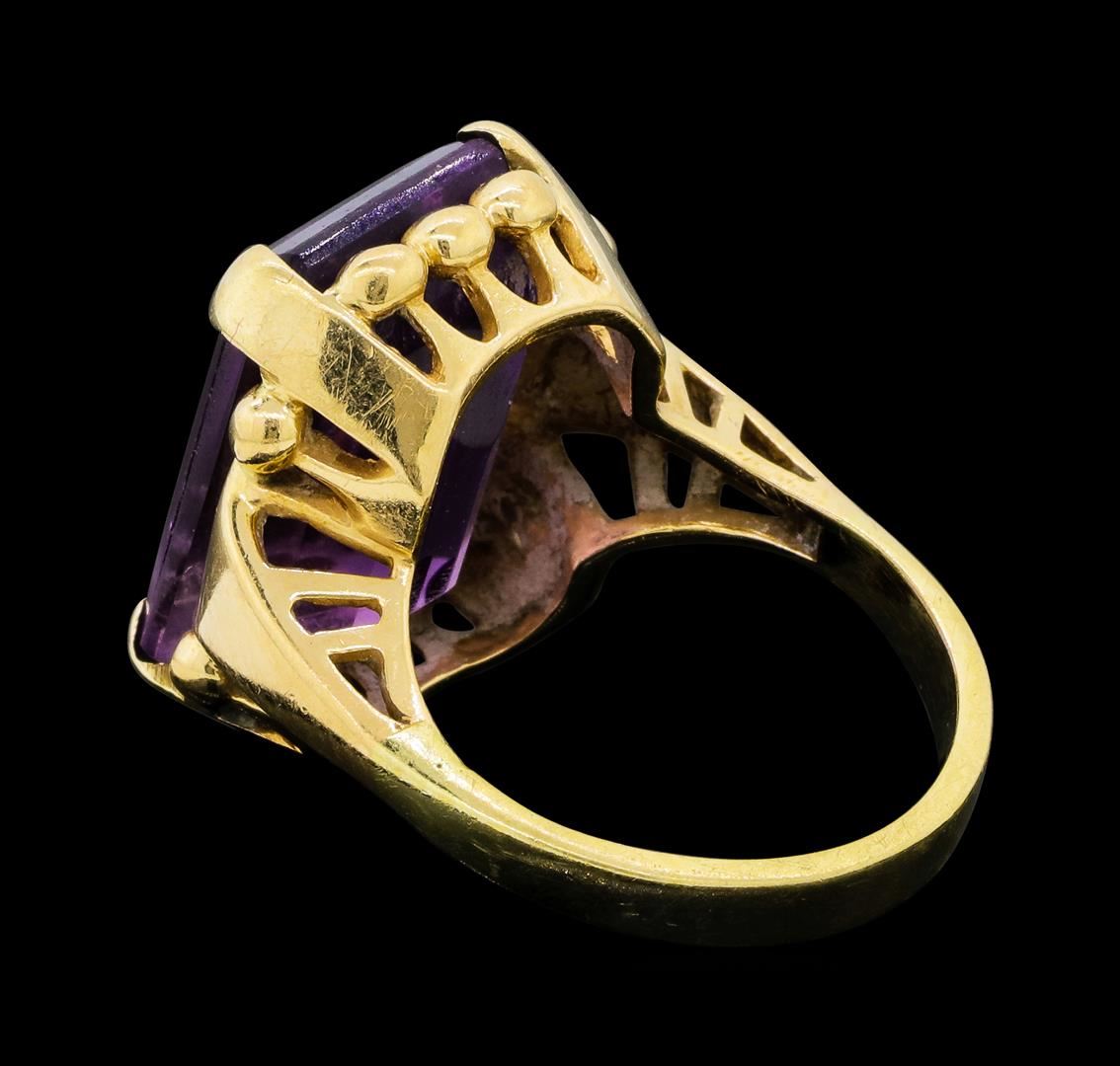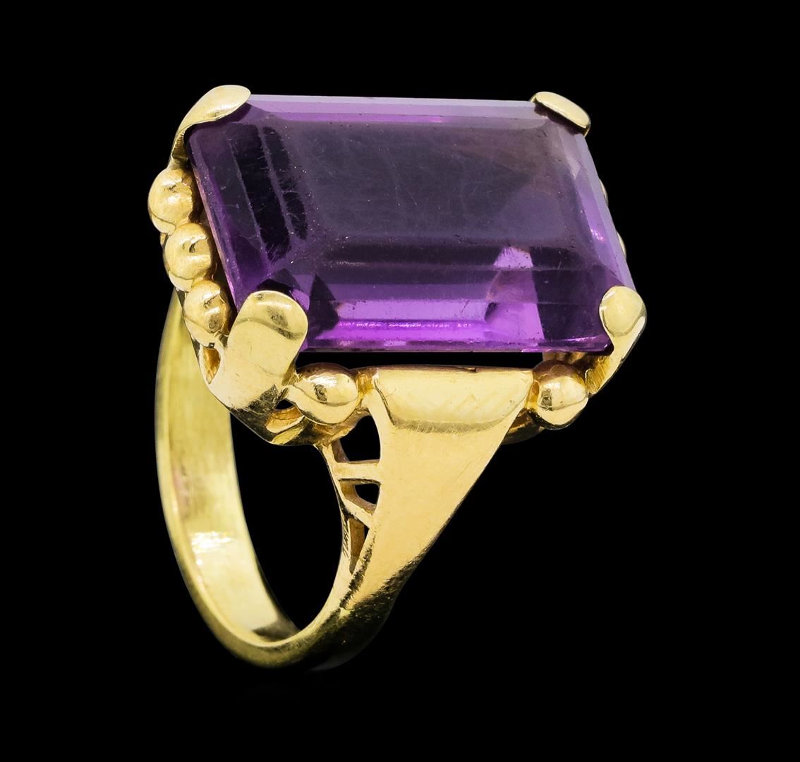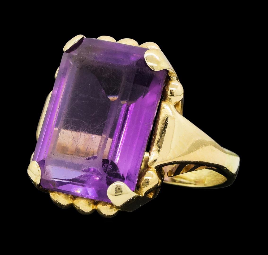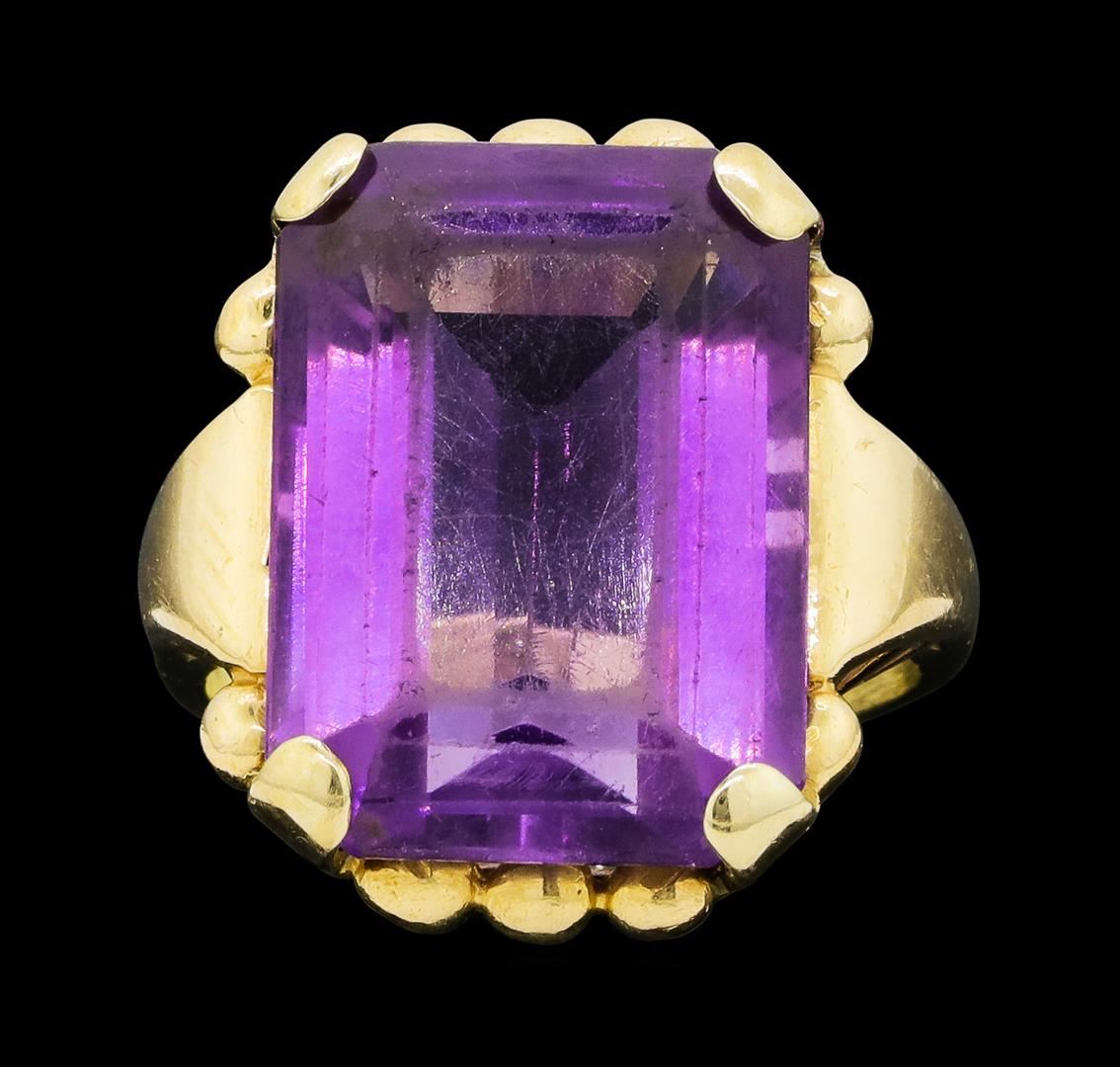 One lady's ring featuring: 14KT yellow gold weighing 9.0 grams containing one emerald cut amethyst weighing 11.50ct. The ring is a size 7.