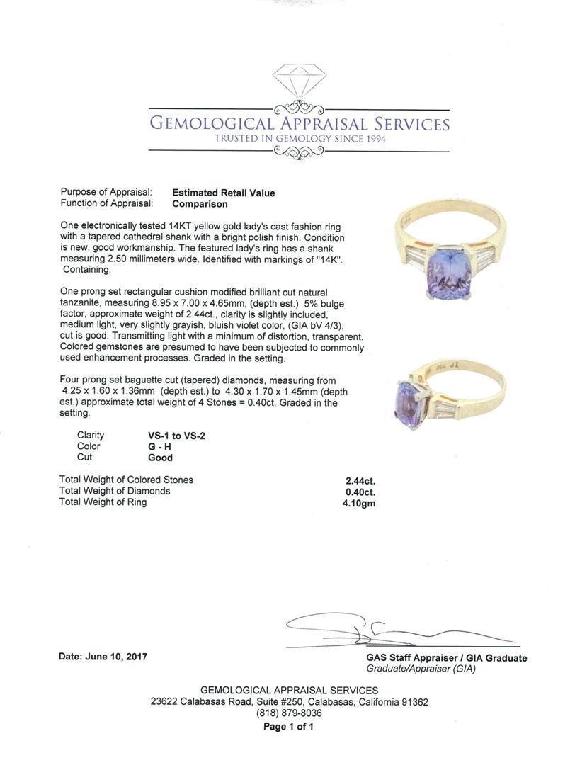 One electronically tested 14KT yellow gold lady's cast fashion ring with a tapered cathedral shank with a bright polish finish. The featured lady's ring has a shank measuring 2.50 millimeters wide. Identified with markings of '14K'. Condition is new, good workmanship. Containing: One prong set rectangular cushion modified brilliant cut natural tanzanite, measuring 8.95 x 7.00 x 4.65mm, (depth est.) 5%. bulge factor, approximate weight of 2.44ct., clarity is slightly included, medium light, very slightly grayish, bluish violet color, (GIA bV 4/3), cut is good. Transmitting light with a minimum of distortion, transparent. Colored gemstones are presumed to have been subjected to commonly used enhancement processes. Graded in the setting. Four prong set baguette cut (tapered) diamonds, measuring from 4.25 x 1.60 x 1.36mm (depth est.) to 4.30 x 1.70 x 1.45mm (depth est.) approximate total weight of 4 Stones = 0.40ct. Graded in the setting. Color G - H Clarity VS-1 to VS-2 Cut Good. Total Weight of Colored Stones 2.44ct.. Total Weight of Diamonds 0.40ct.. Total Weight of Ring 4.10gm GAS Appraised.