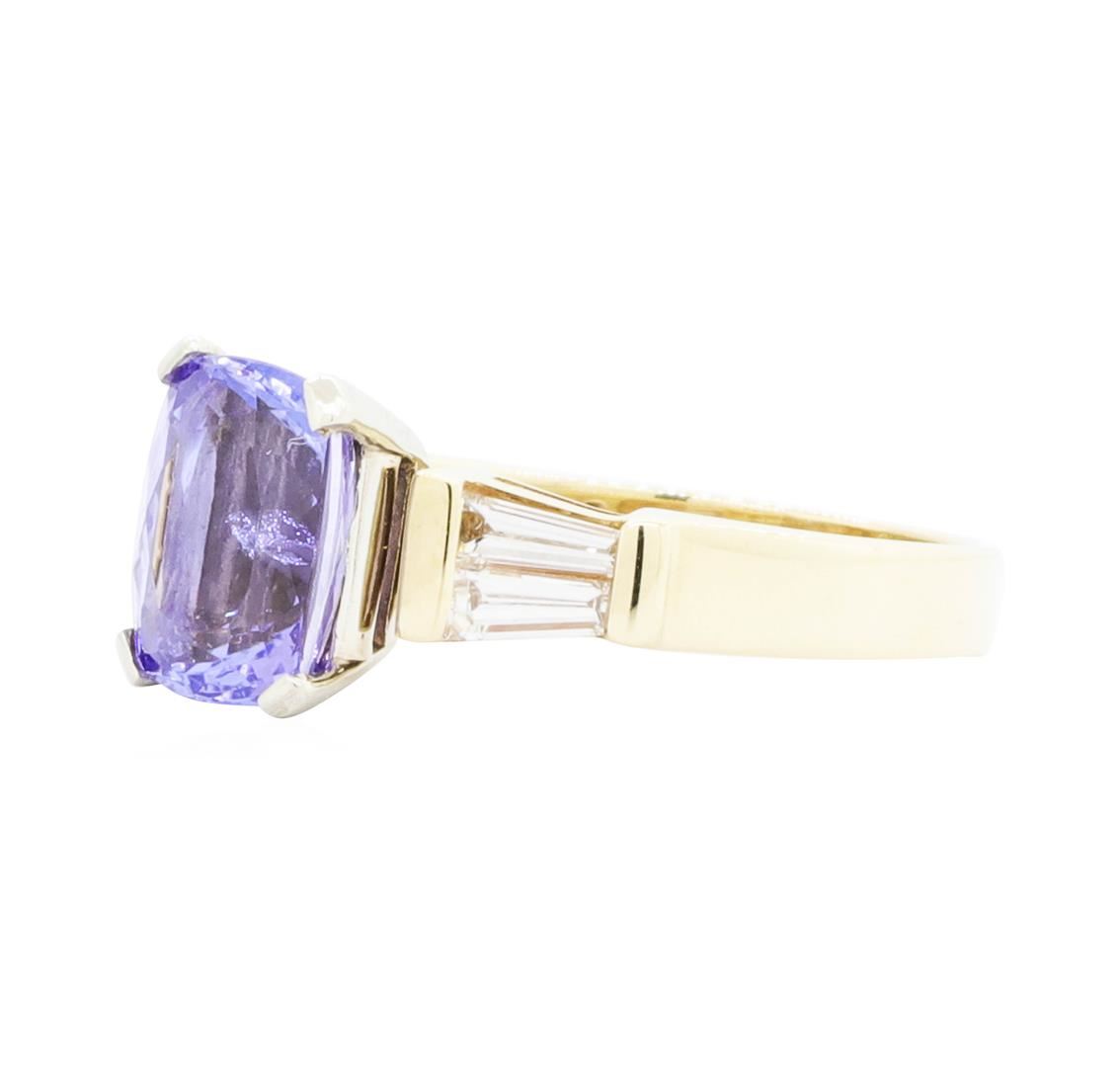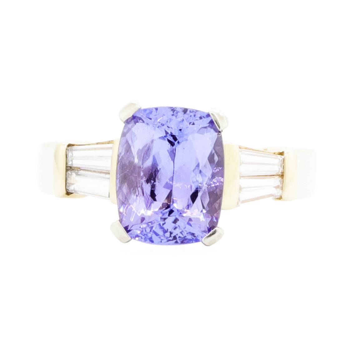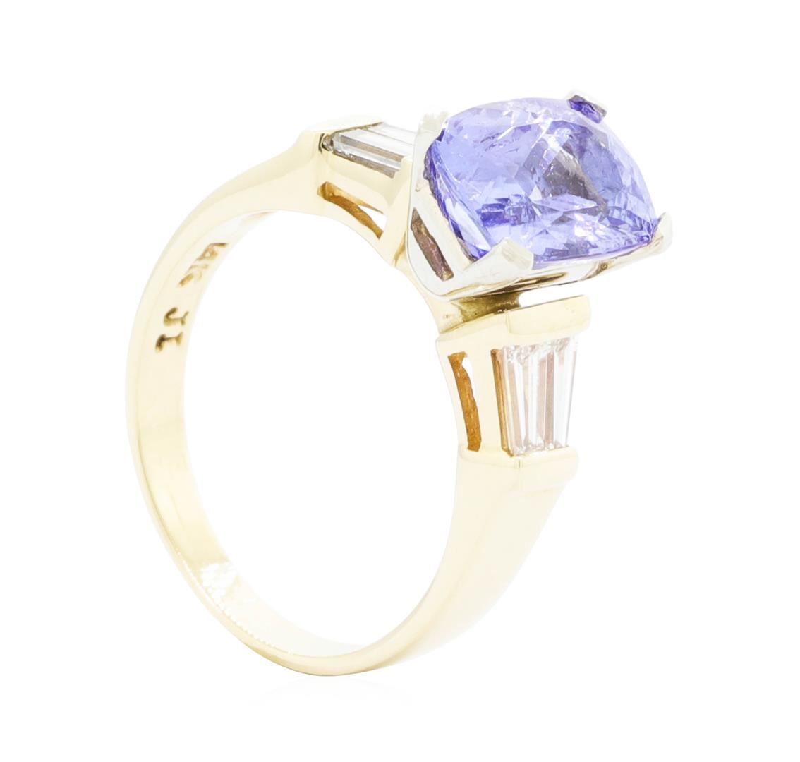One electronically tested 14KT yellow gold lady's cast fashion ring with a tapered cathedral shank with a bright polish finish. The featured lady's ring has a shank measuring 2.50 millimeters wide. Identified with markings of '14K'. Condition is new, good workmanship. Containing: One prong set rectangular cushion modified brilliant cut natural tanzanite, measuring 8.95 x 7.00 x 4.65mm, (depth est.) 5%. bulge factor, approximate weight of 2.44ct., clarity is slightly included, medium light, very slightly grayish, bluish violet color, (GIA bV 4/3), cut is good. Transmitting light with a minimum of distortion, transparent. Colored gemstones are presumed to have been subjected to commonly used enhancement processes. Graded in the setting. Four prong set baguette cut (tapered) diamonds, measuring from 4.25 x 1.60 x 1.36mm (depth est.) to 4.30 x 1.70 x 1.45mm (depth est.) approximate total weight of 4 Stones = 0.40ct. Graded in the setting. Color G - H Clarity VS-1 to VS-2 Cut Good. Total Weight of Colored Stones 2.44ct.. Total Weight of Diamonds 0.40ct.. Total Weight of Ring 4.10gm GAS Appraised.