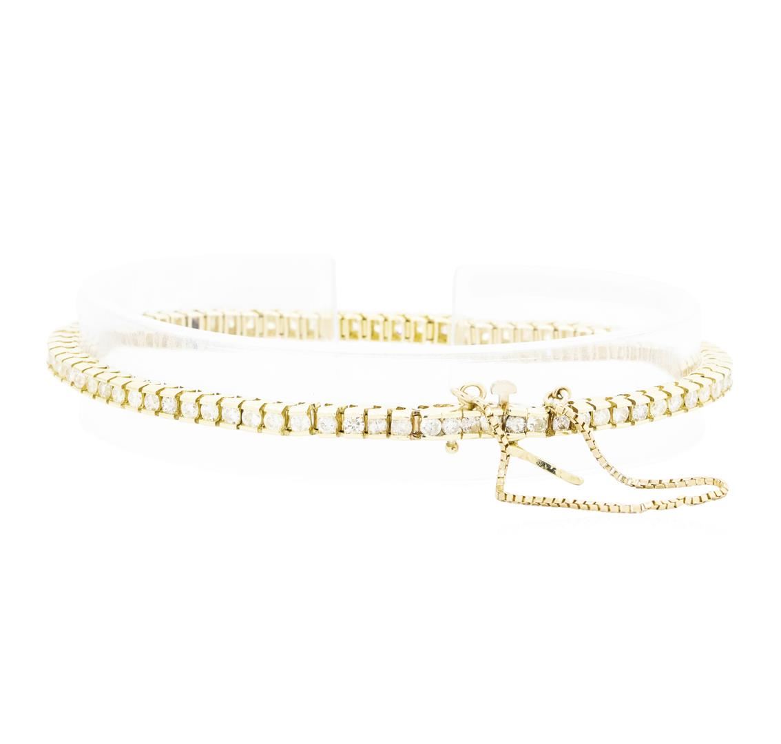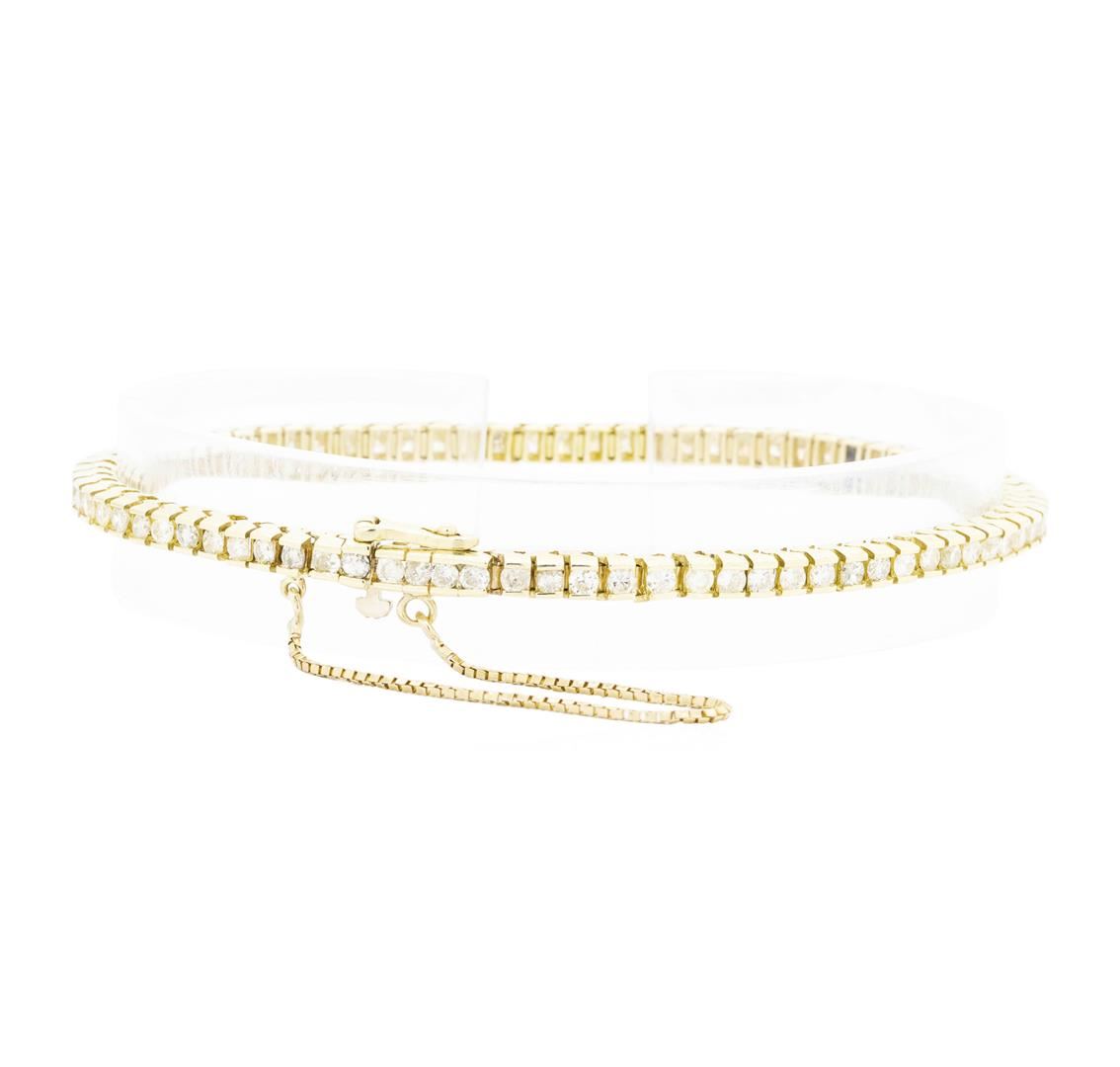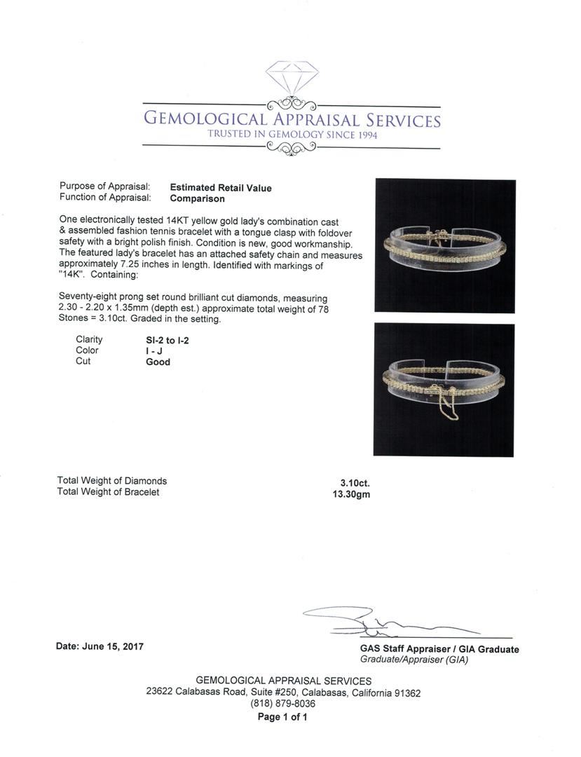 One electronically tested 14KT yellow gold lady's combination cast & assembled fashion tennis bracelet with a tongue clasp with foldover safety with a bright polish finish. The featured lady's bracelet has an attached safety chain and measures approximately 7.25 inches in length. Identified with markings of '14K'. Condition is new, good workmanship. Containing: Seventy-Eight prong set round brilliant cut diamonds, measuring 2.30 - 2.20 x 1.35mm (depth est.) approximate total weight of 78 Stones = 3.10ct. Graded in the setting. Color I - J Clarity SI-2 to I-2 Cut Good. Total Weight of Diamonds 3.10ct.. Total Weight of Bracelet 13.30gm GAS Appraised.