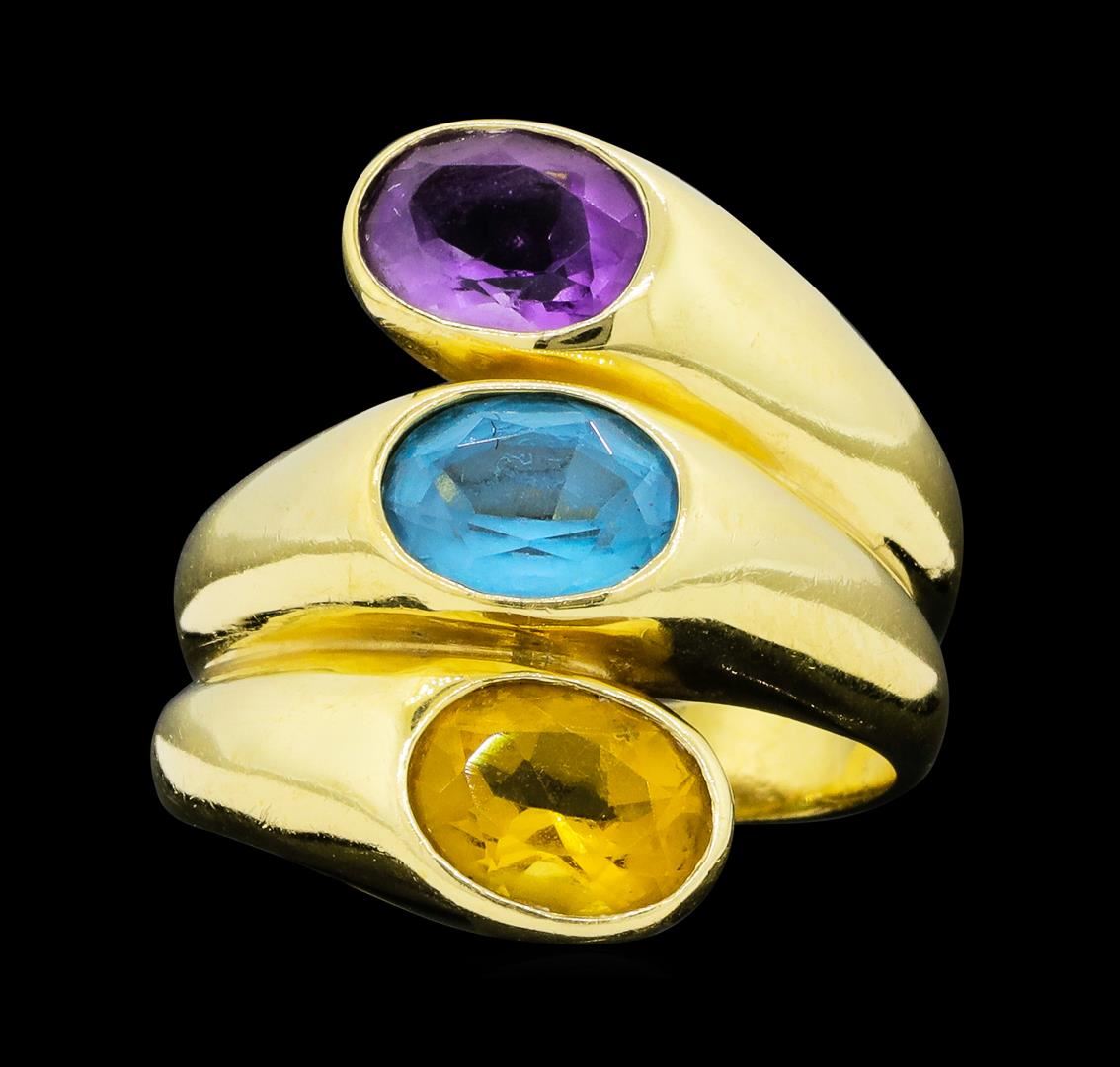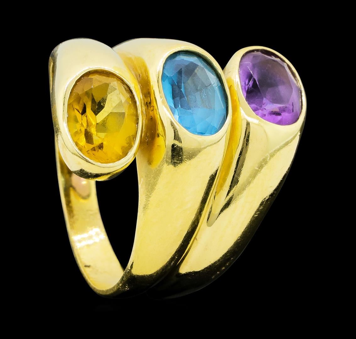 One lady's ring featuring: 14KT yellow gold weighing 7.8 grams containing one citrine, one blue topaz and one amethyst weighing a total of 4.50ctw. The ring is a size 7.5.