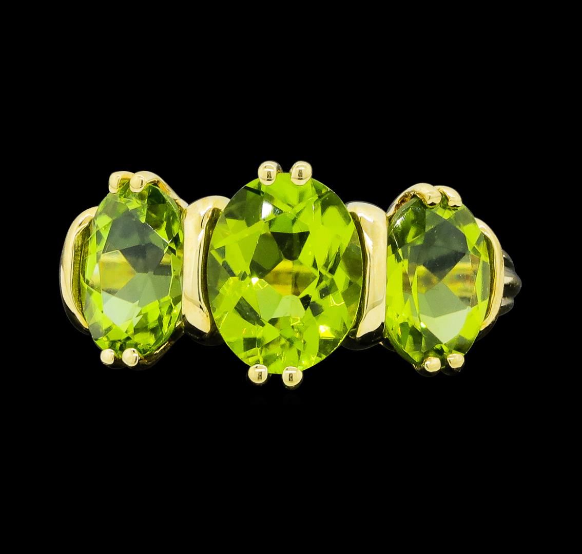 One lady's ring featuring: 14KT yellow gold weighing 3.8 grams containing three oval cut peridots weighing approximately 5.00ctw. The ring is a size 7.5.