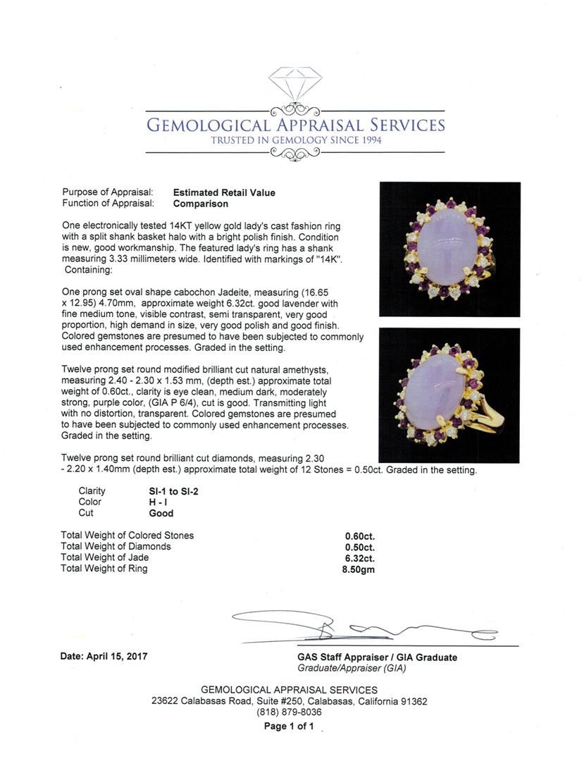 One electronically tested 14KT yellow gold lady's cast fashion ring with a split shank basket halo with a bright polish finish. Condition is new, good workmanship. The featured lady's ring has a shank measuring 3.33 millimeters wide. Identified with markings of "14K". Containing: One prong set oval shape cabochon Jadeite, measuring (16.65 x 12.95) 4.70mm, approximate weight 6.32ct good lavender with fine medium tone, visible contrast, semitransparent, very good proportion, high demand size, very good polish and good finish. Colored gemstones are presumed to have been subjected to commonly used enhancement processes. Graded in setting. Twelve prong set round modified brilliant cut natural amethysts, measuring 2.40 - 2.30 x 1.53mm, (depth est.) approximate total weight of 0.60ct., clarity is eye clean, medium dark, moderately strong, purple color, (GIA P 6/4), cut is good. Transmitting light with no distortion, transparent. Colored gemstones are presumed to have been subjected to commonly used enhancement processes. Graded in the setting. Twelve prong set round brilliant cut diamonds, measuring 2.30 - 2.20 x 1.40mm (depth est.) approximate total weight of 12 stones = 0.50ct. Graded in setting. Clarity: SI-1 to SI-2, Color: H-I, Cut: Good. Total Weight of Colored Stones: 0.60ct, Total weight of Diamonds: 0.50ct, Total Weight of Jade: 6.32ct, Total Weight of Ring: 8.50gm. GAS Appraised.