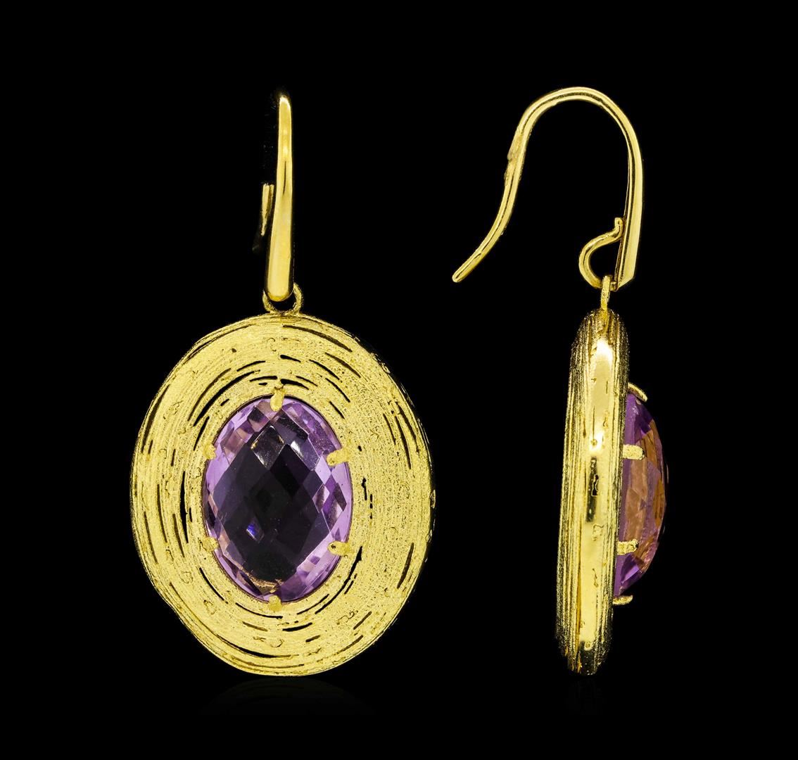 One pair of Ladies dangle earrings featuring: 14KT yellow gold weighing 7.0 grams containing two checkerboard double cabochon amethysts. The earrings have a drop of 40 millimeters.