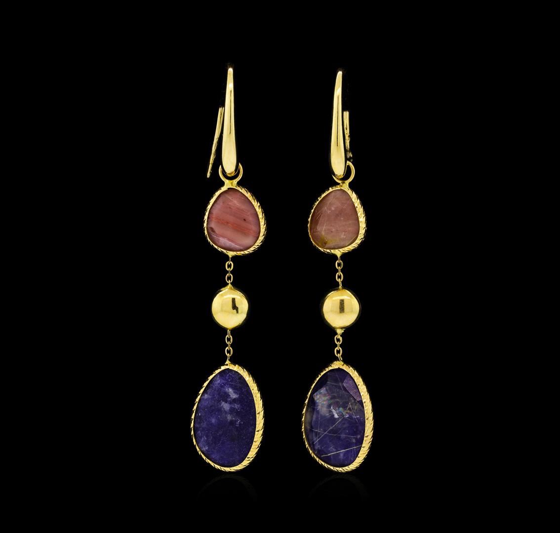 One pair of Ladies dangle earrings featuring: 14KT yellow gold weighing 5.3 grams containing two blue quartz and two rose quartz. The earrings have a drop of 59 millimeters.
