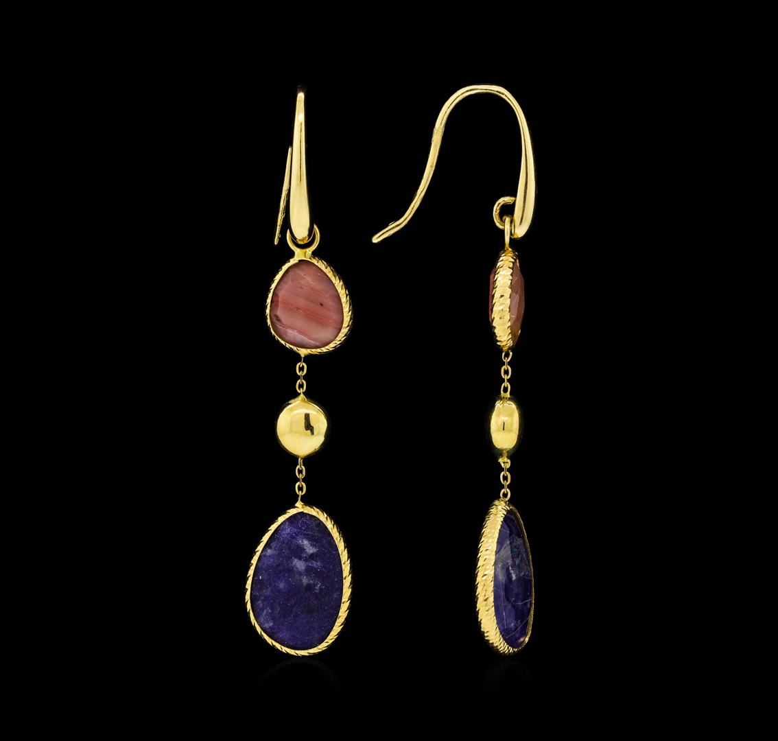 One pair of Ladies dangle earrings featuring: 14KT yellow gold weighing 5.3 grams containing two blue quartz and two rose quartz. The earrings have a drop of 59 millimeters.