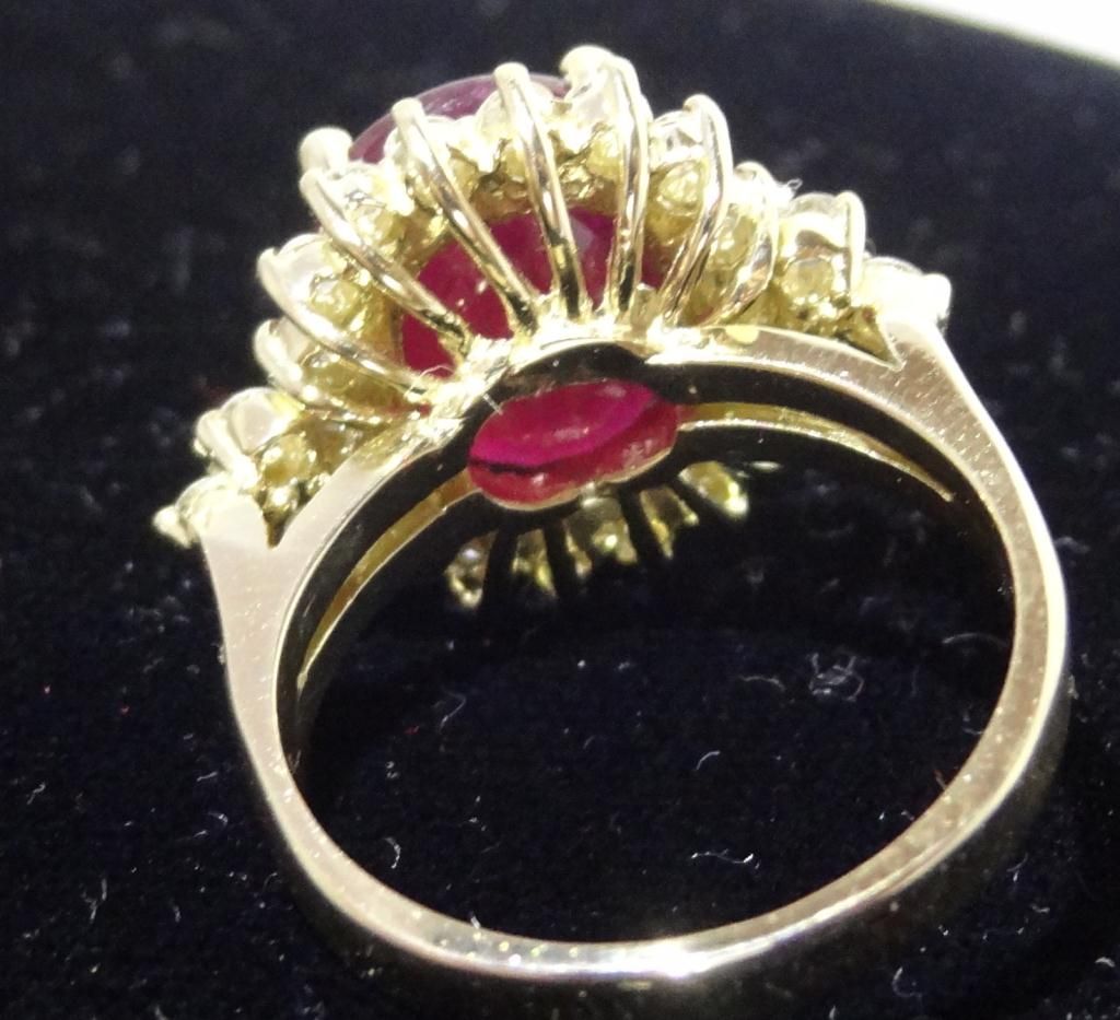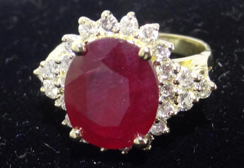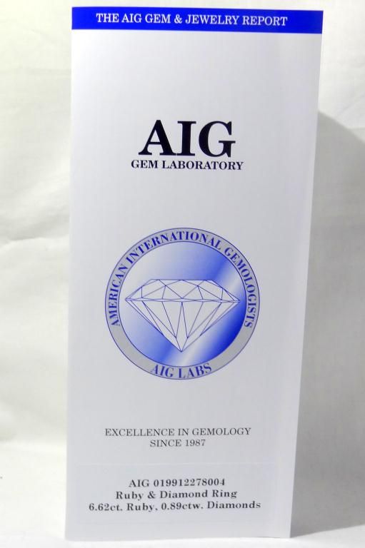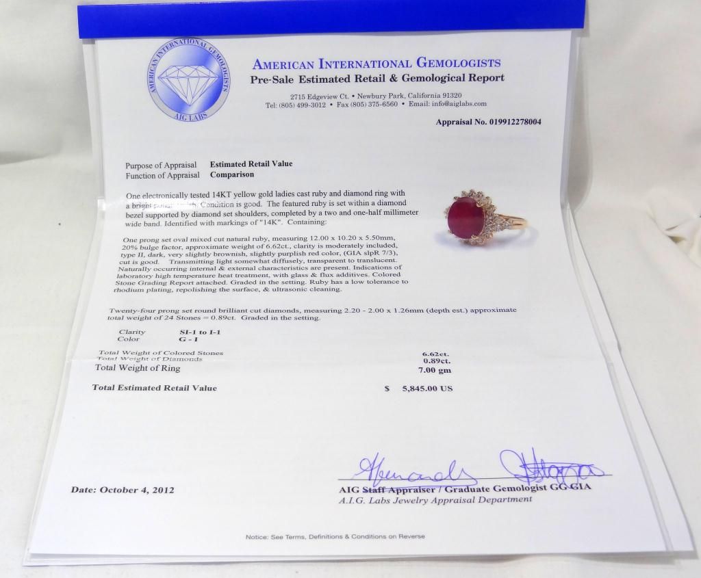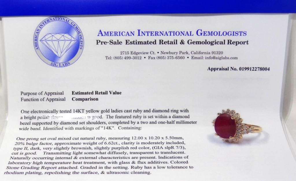 Size "6.25" Comes with AIG (American International Gemologist) Appraisal! Electronically tested, bright polish finish. Condition is good. The featured Ruby is set within a diamond bezel supported by diamond set shoulders, completed by a two and one-half millimeter wide band. Bright polish finish with rhodium accents. Identified with the markings of "14k". Containing:
